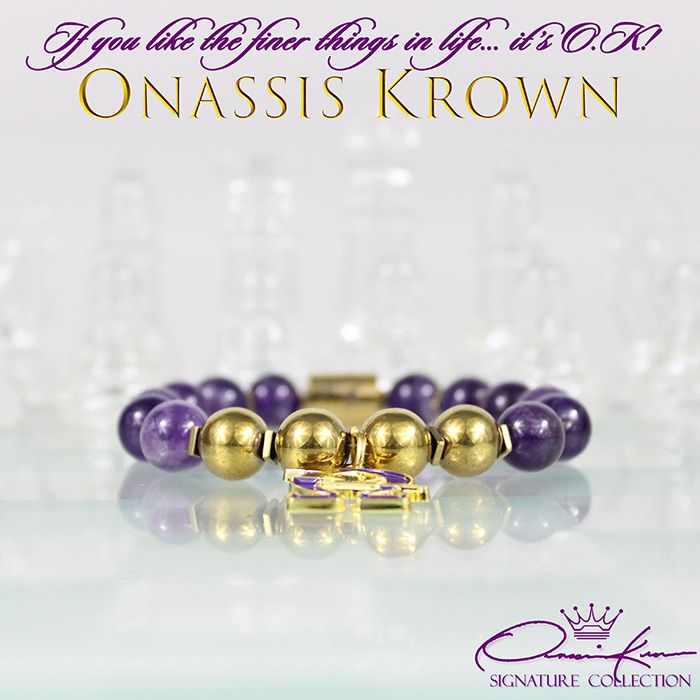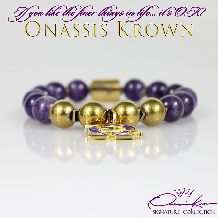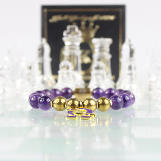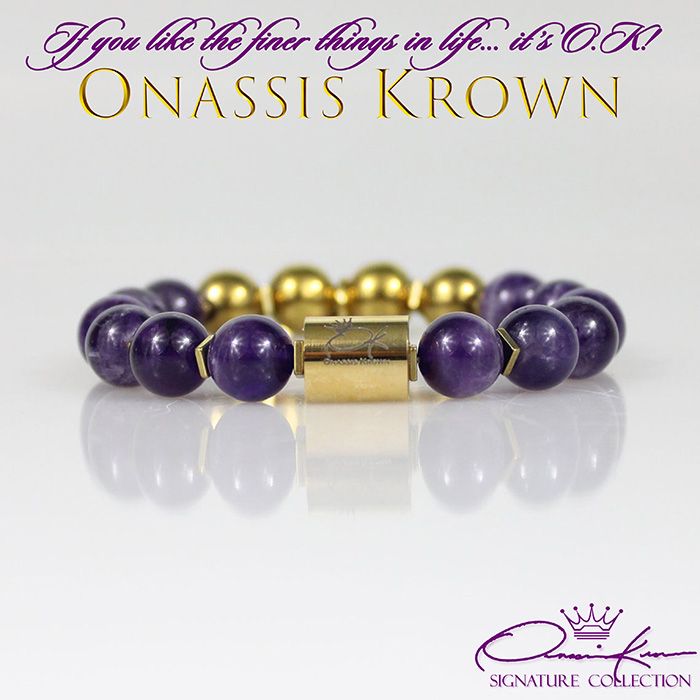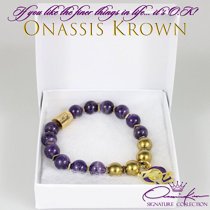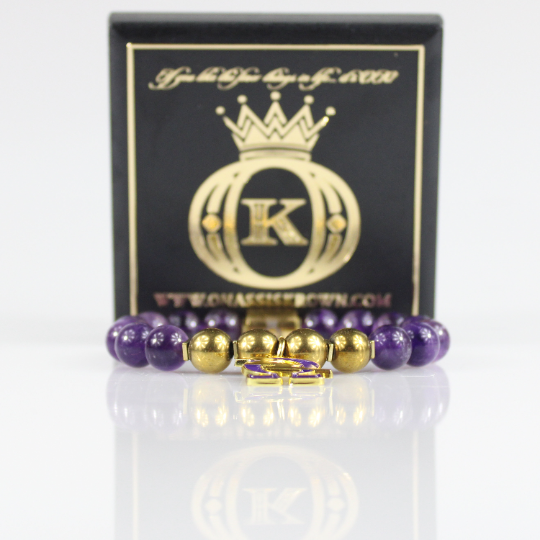 One side boasts four gold metallic beads. Enjoy a classy array of purple & gold in this "One Of A Kind” piece. All bracelets come in a gift box!