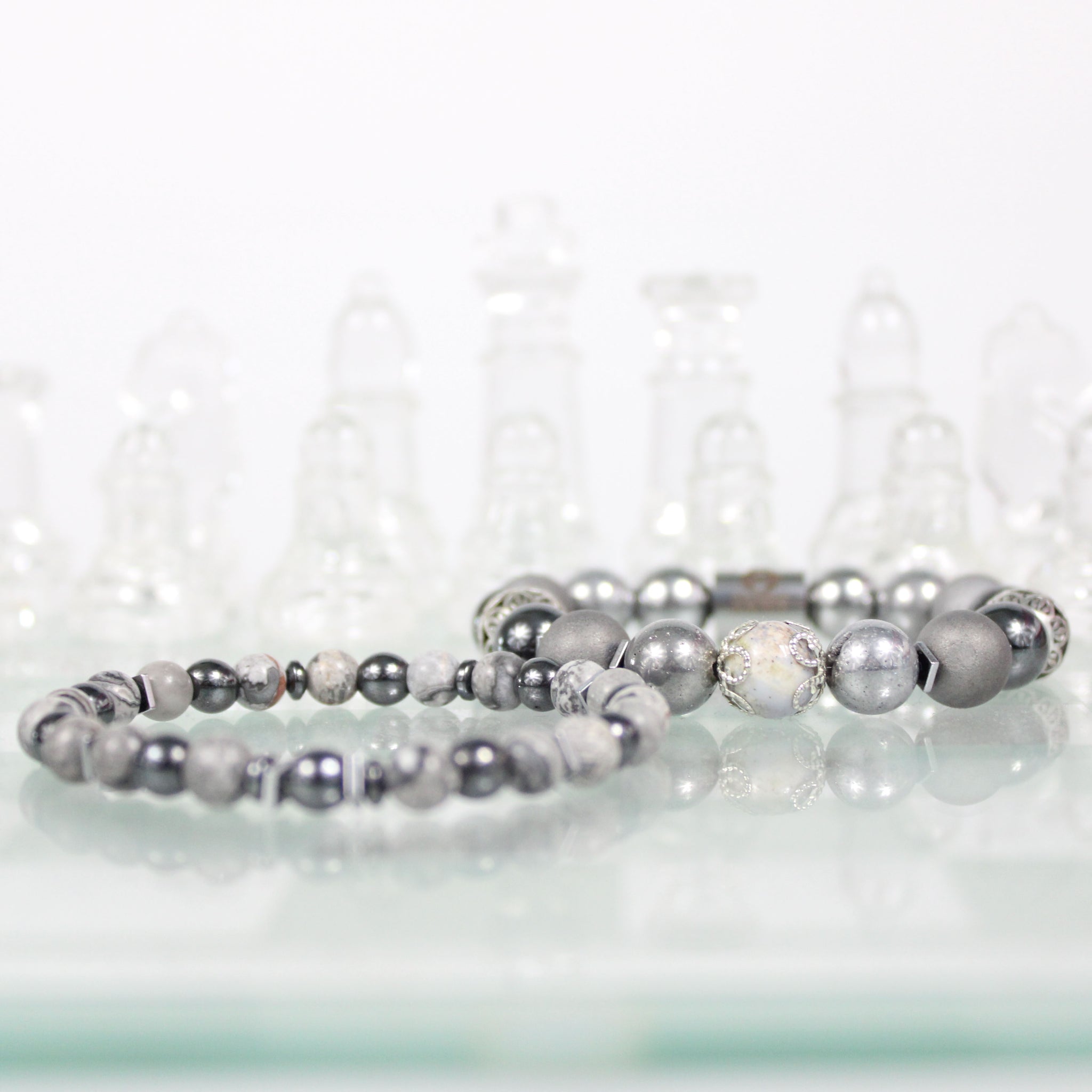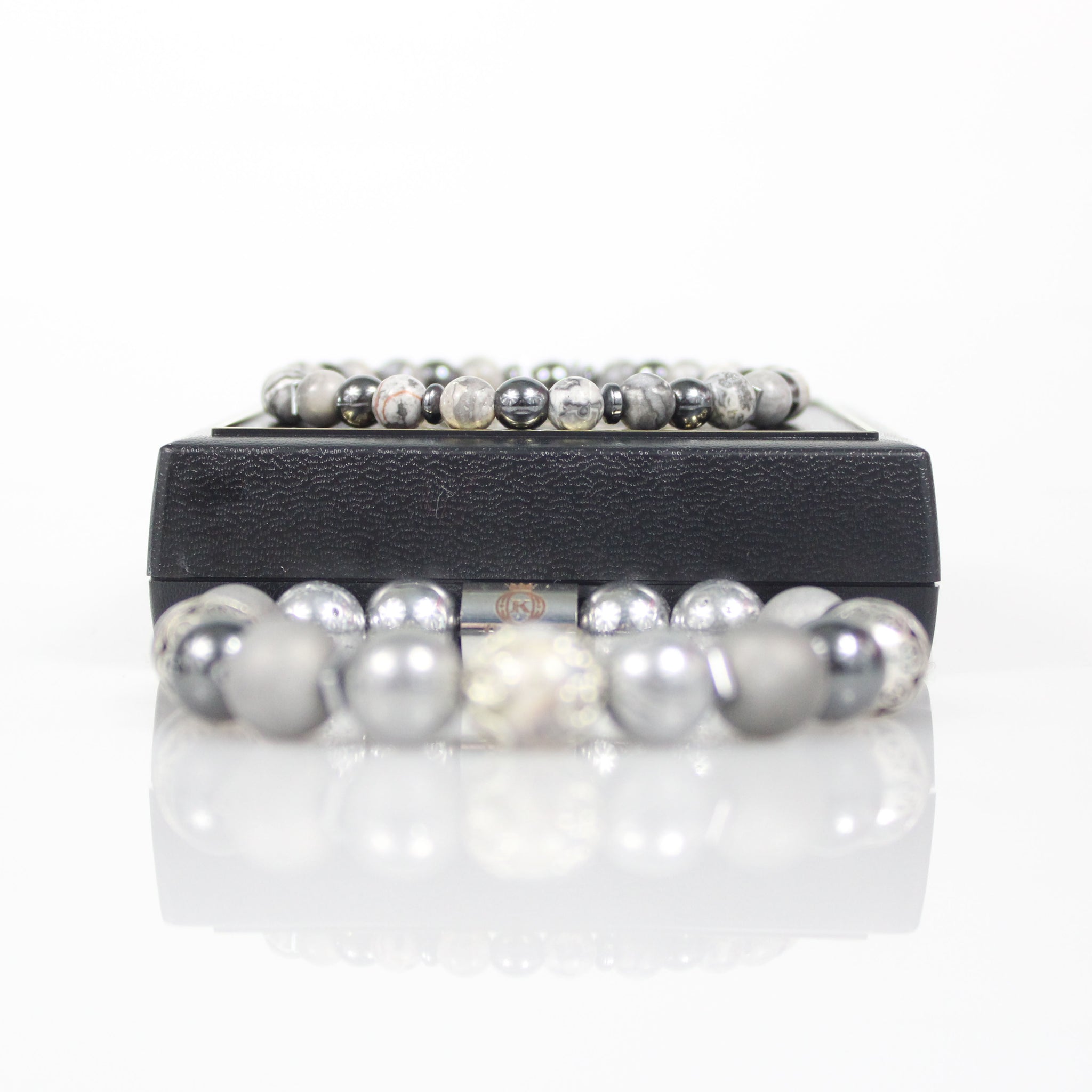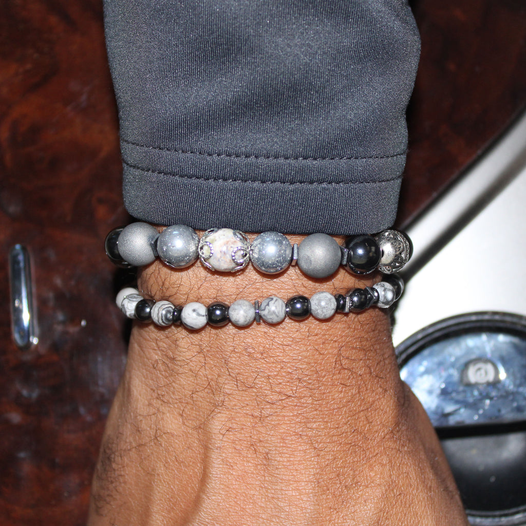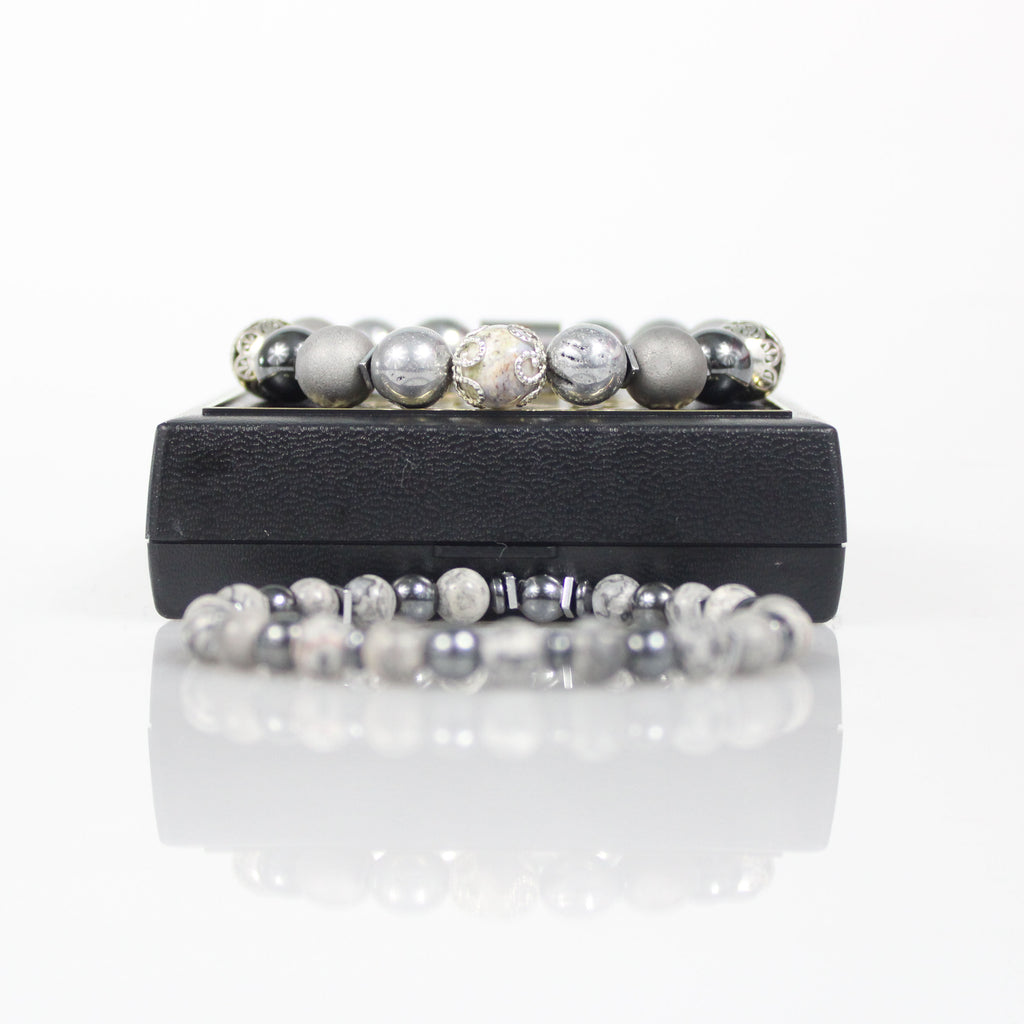 This fabulous bracelet comes as a stackable combination. The larger bracelet displays beautiful matte gray jade 10mm beads, shiny silver and magnetic hematite beads which contain gray marble like veins with a magnetic hematite center bead.