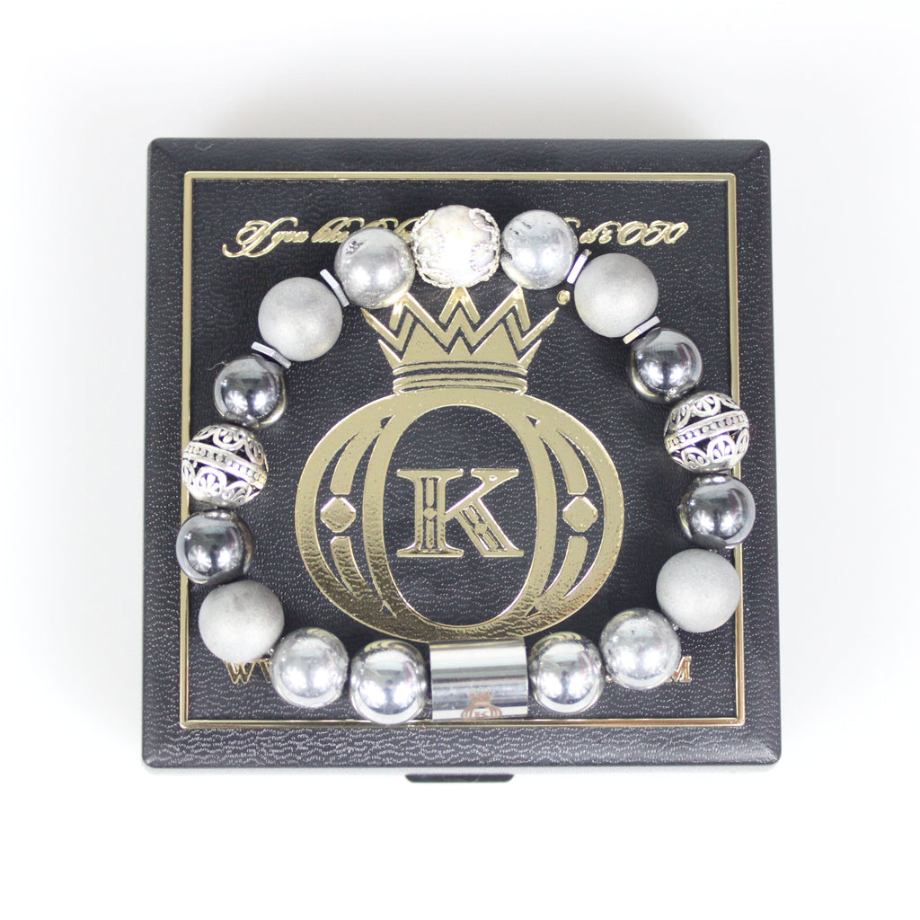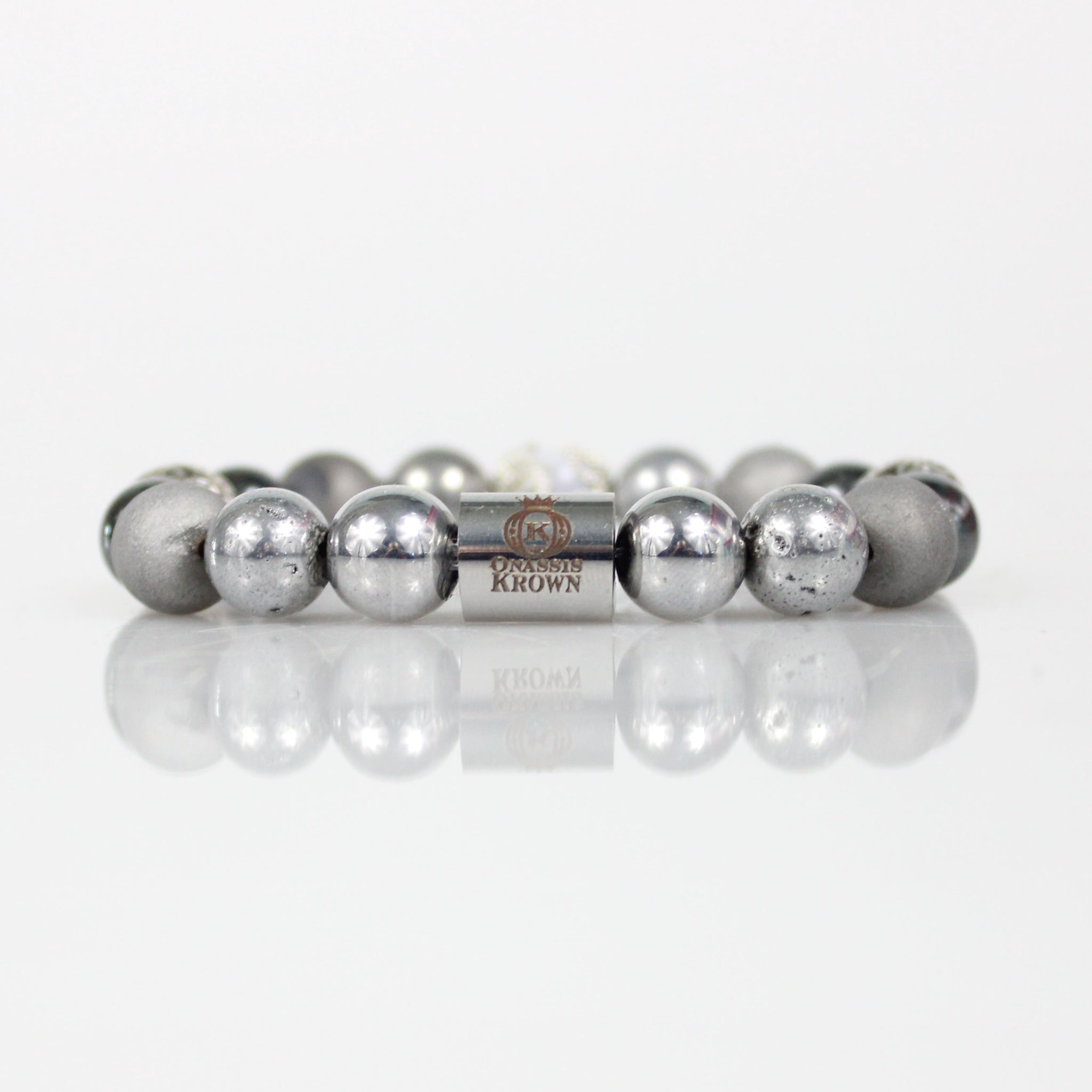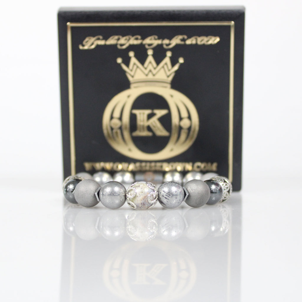 MATTE GRAY JADE, HIGH SILVER GLITTER BEADS & MAGNETIC HEMATITE BRACELET: