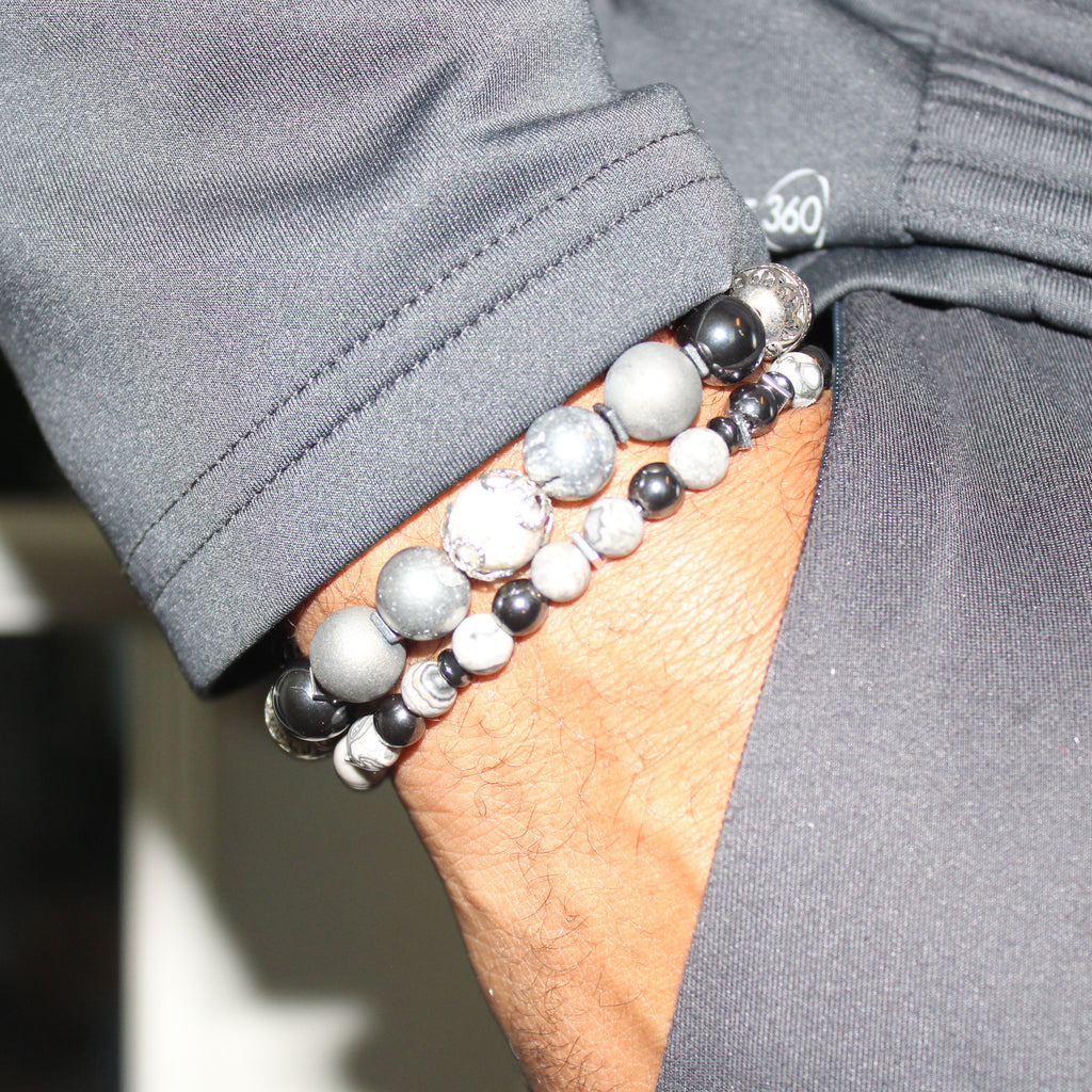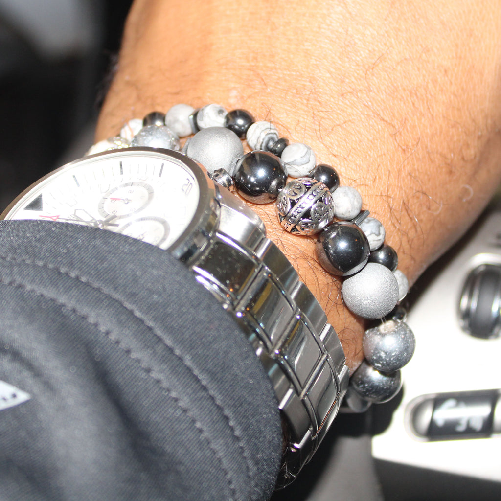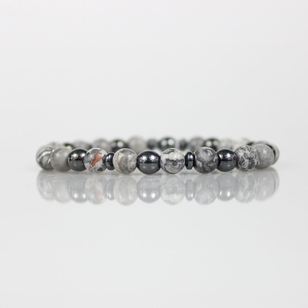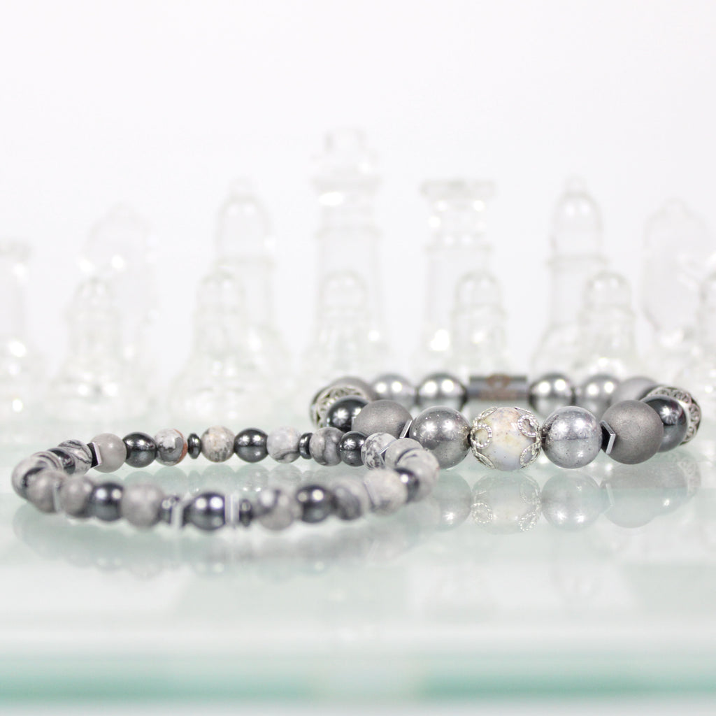 The second bracelet features the same type beautiful marble gray beads with white veins but in 6mm along with smaller 6mm magnetic hematite beads and spacers!