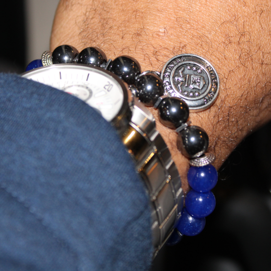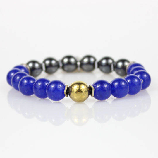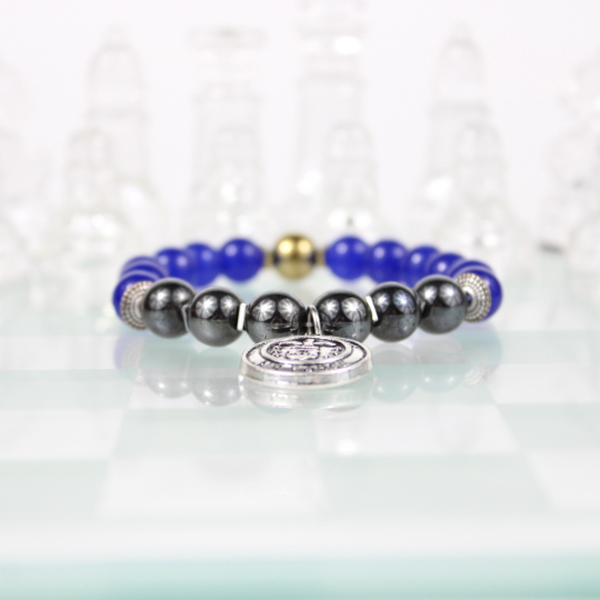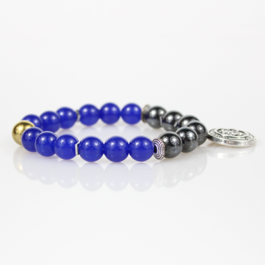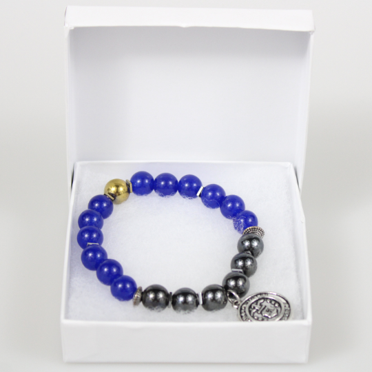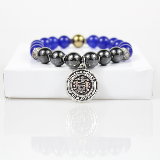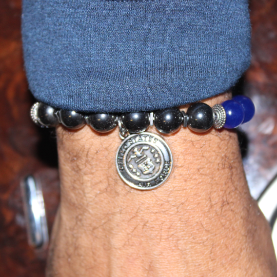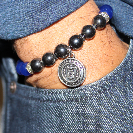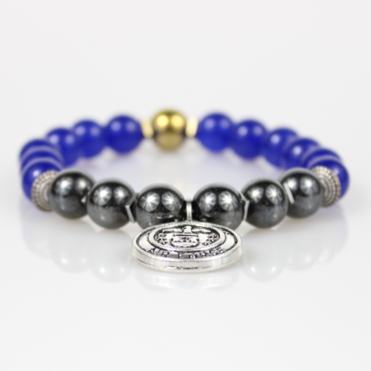 This bracelet was created to honor our active duty military & veterans of the U.S. Air Forces. It is specially designed to not only be beautiful but to provide protection for airmen on deployment. It is made with the Air Force’s colors of Blue, Silver & Gold. It has a Yellow Gold 10mm center bead, Air Force Blue Beads and Silver Hematite beads. Bracelet features a single Gold Bead to honor the P.O.W.’s, M.I.A.’s and the fallen!
