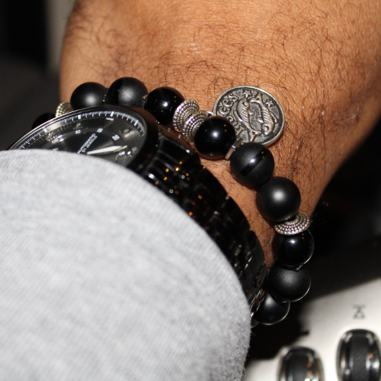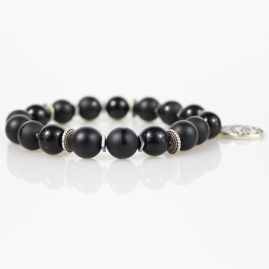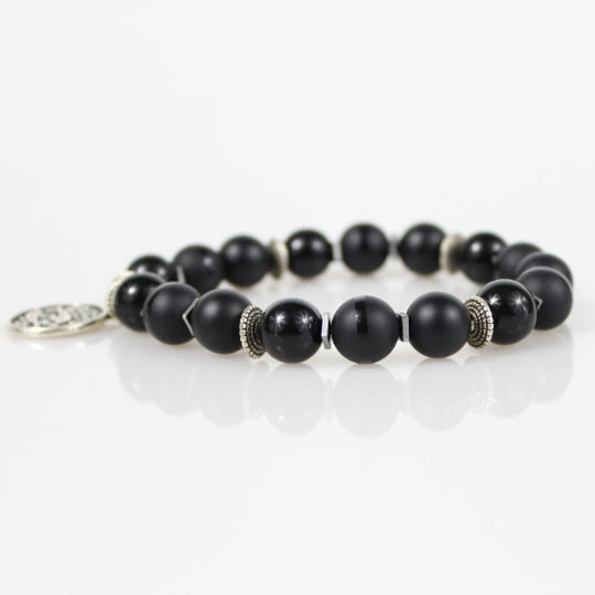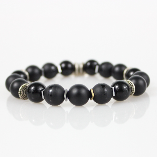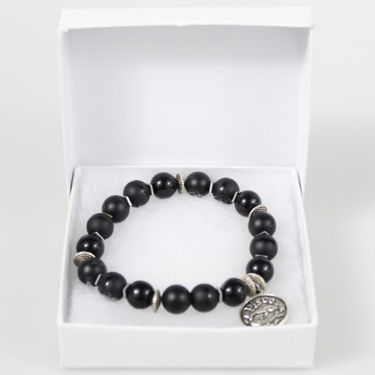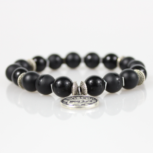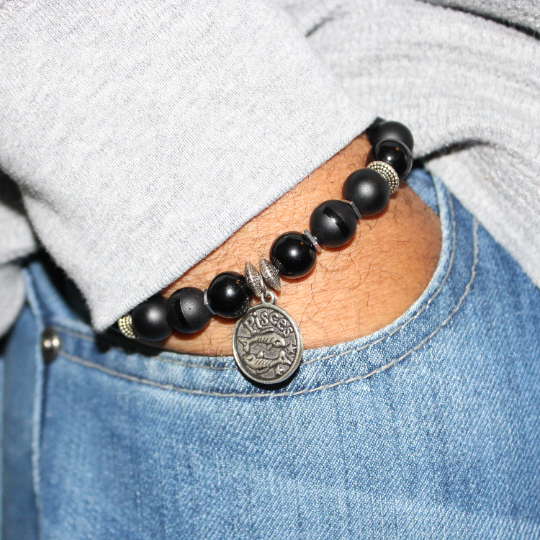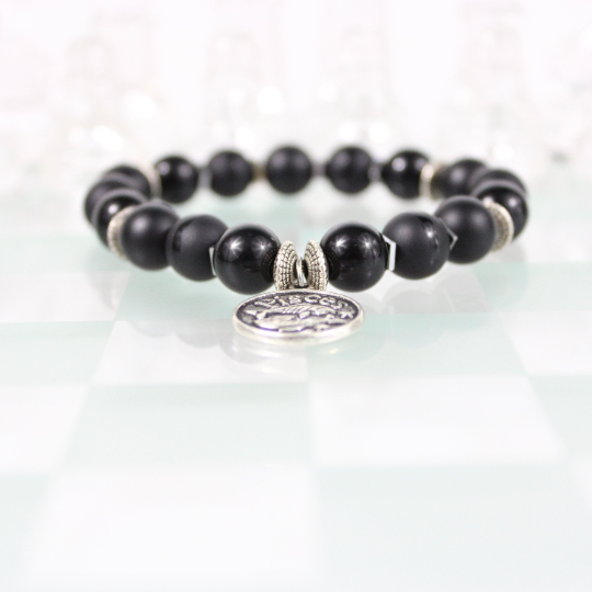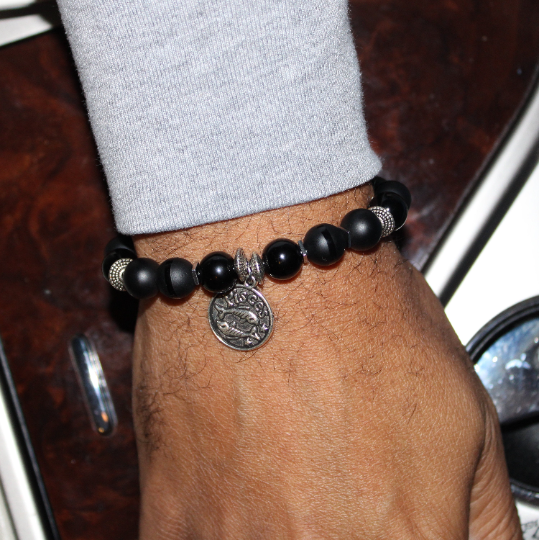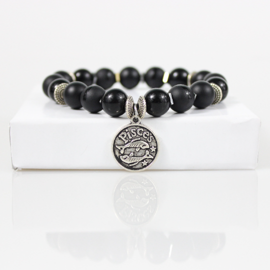 Zodiac Bracelet with 10mm Black Onyx beads alternating Hematite rondelles, silver square hematite spacers, Matte Black, Shiny Gloss and Polished Stripe beads and an Antique Silver Zodiac/Horoscope Pendant. This "One Of A Kind” piece with your choice of birthstone colored beads and zodiac charm. All bracelets come in a gift box!