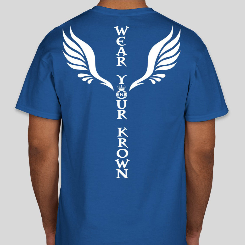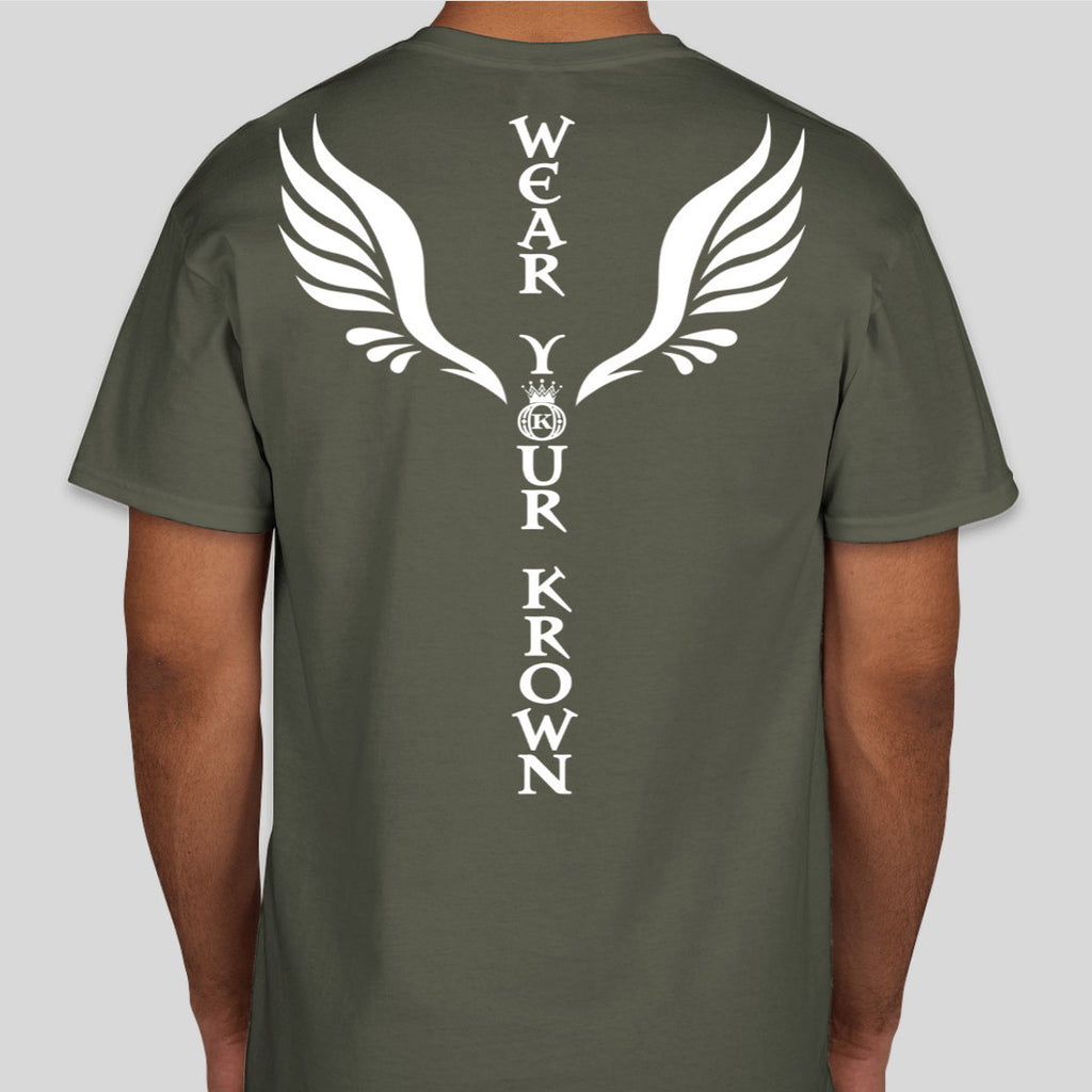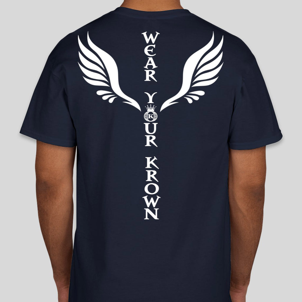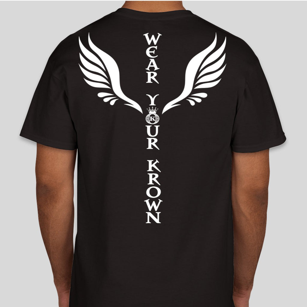 - Back Design: Vertical “Wear Your Krown” with wing accents — representing elevation, freedom, and purpose