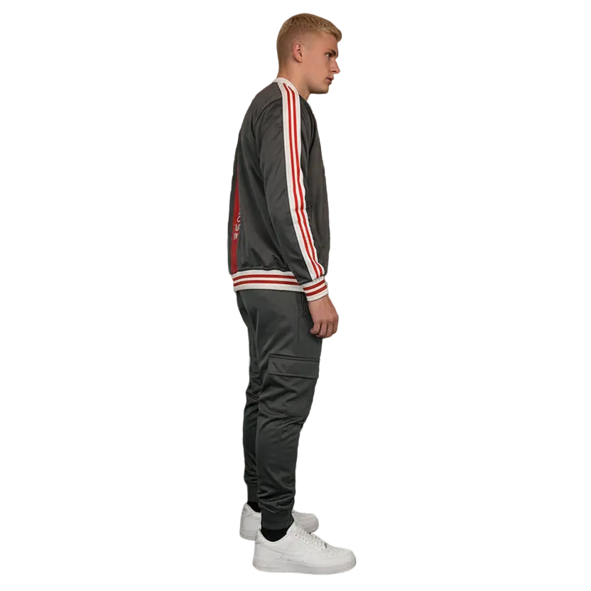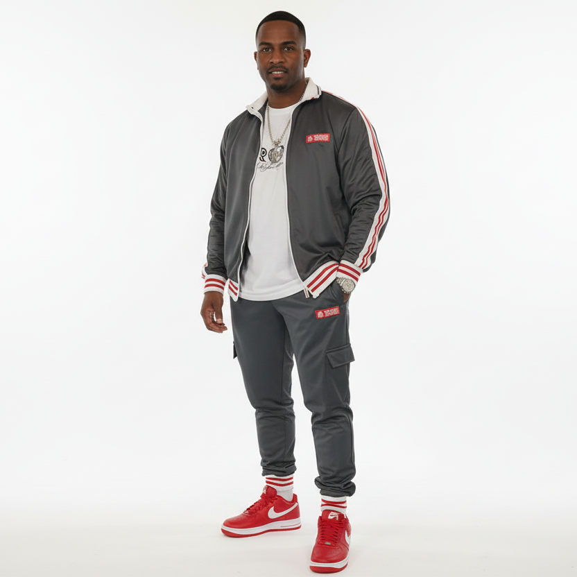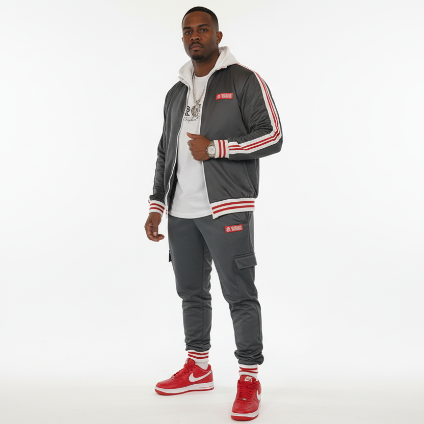 ANOTHER ONE... Onassis Krown has done it again with this stylish red label athletic tracksuit in Gray. Both styles come with red pin stripes on the ribbed stand up collar, side sleeves, waistband and the ankle cuffs. This polyester & cotton blend set is strong yet comfortable and can be worn all year round! Attention to DETAIL is the name of this game...