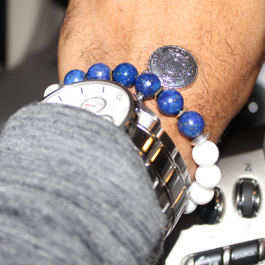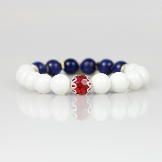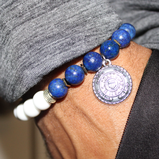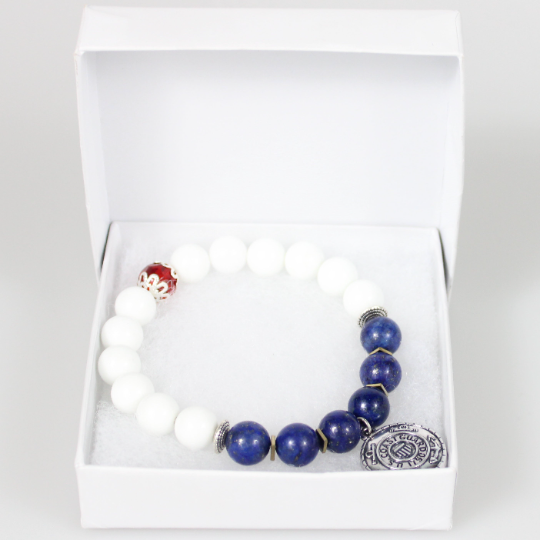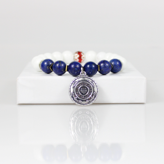 This bracelet was created to honor our active duty military & veterans of the U.S. Coast Guard. It is specially designed to not only be beautiful but to provide protection for sailors on deployment. It is made with the Coast Guard colors of Blue, White, Red & Gold accents. Also boasts an Antique Silver Department of the Coast Guard Pendant. Enjoy this classy "One Of A Kind” piece. This bracelet makes a great gift for a new sailor graduating from boot camp, a promotion, newly commissioned officers, retirement ceremonies or to simply honor our troops and veterans!