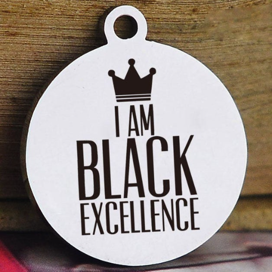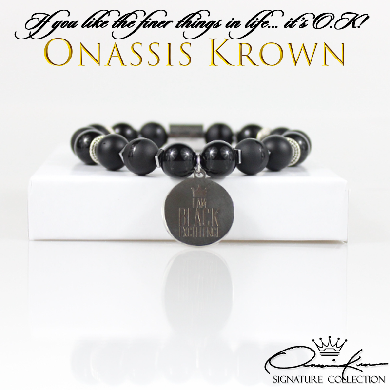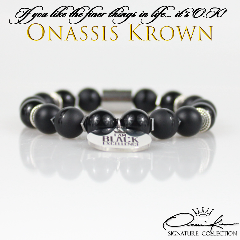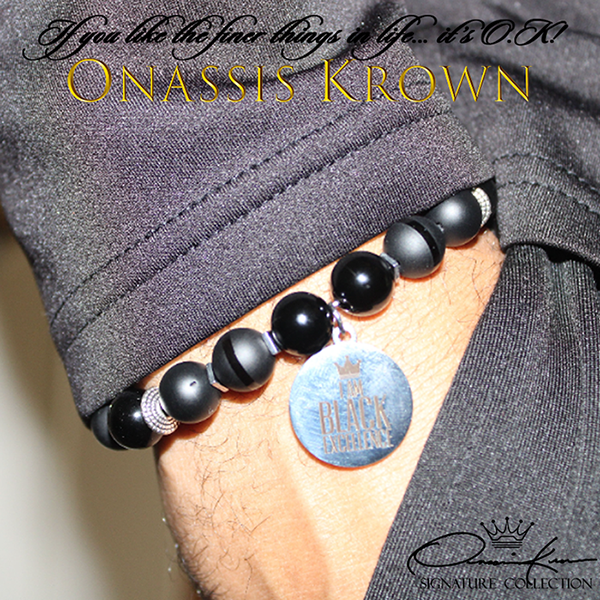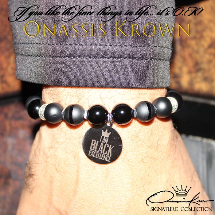 This stunning king bracelet is made with black jade and onyx in three types of 10mm beads including black matte, glossy black with a matte bead with shiny polished stripe. It has a sterling silver charm pendant with "I Am Black Excellence" on the front.