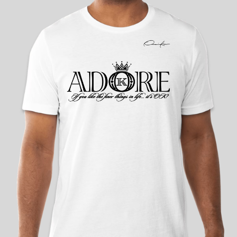Adore motivational T-Shirt with the official Onassis Krown signature on the front chest over the heart and vertical, angel wings spinal cord logo on the back. If you don't see the Onassis Krown label on the inside then it's NOT official! "If you like the finer things in life... it's OK!"