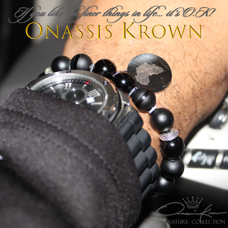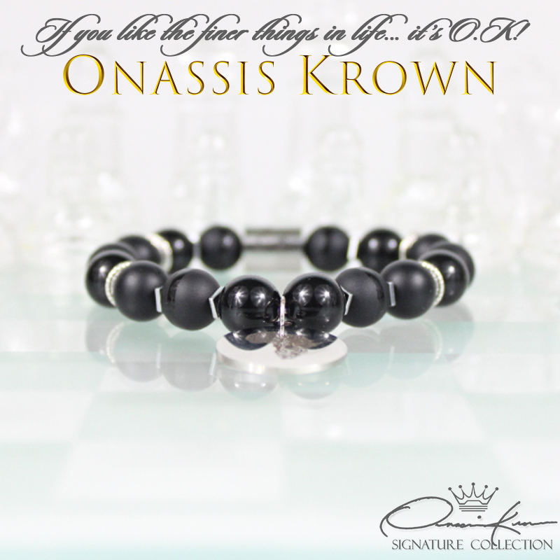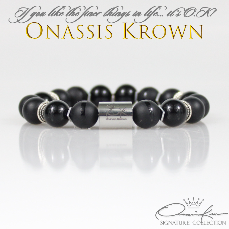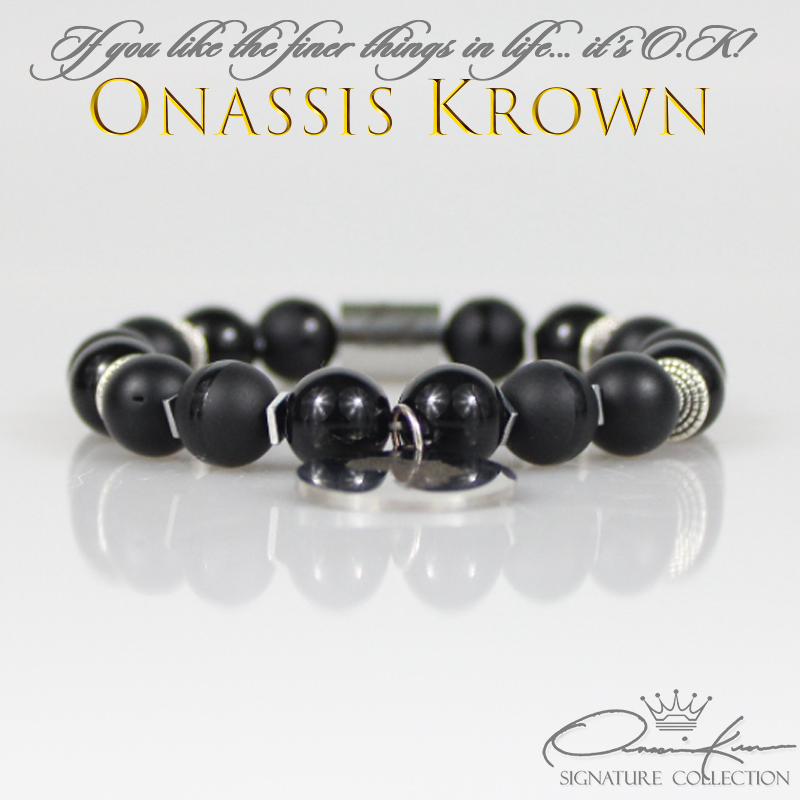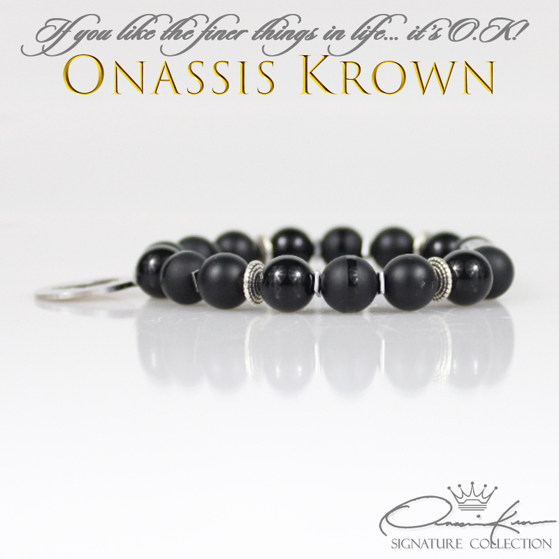 This stunning bracelet is made with black jade and onyx in three types of 10mm beads including black matte, glossy black with a matte bead with shiny polished stripe.
