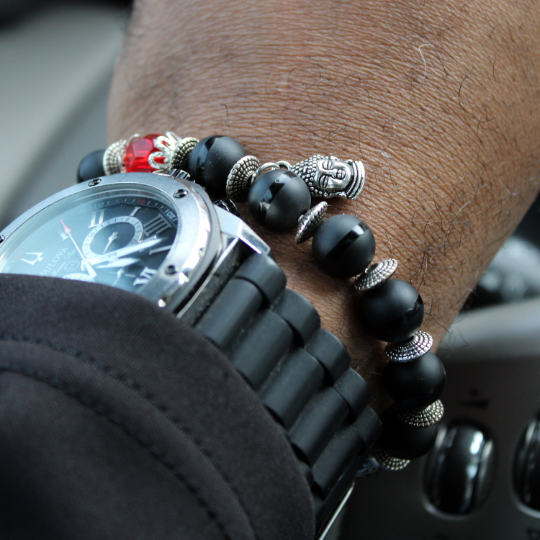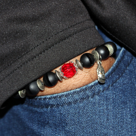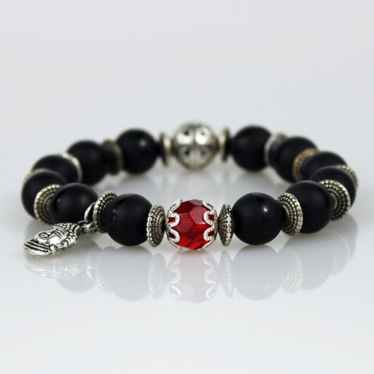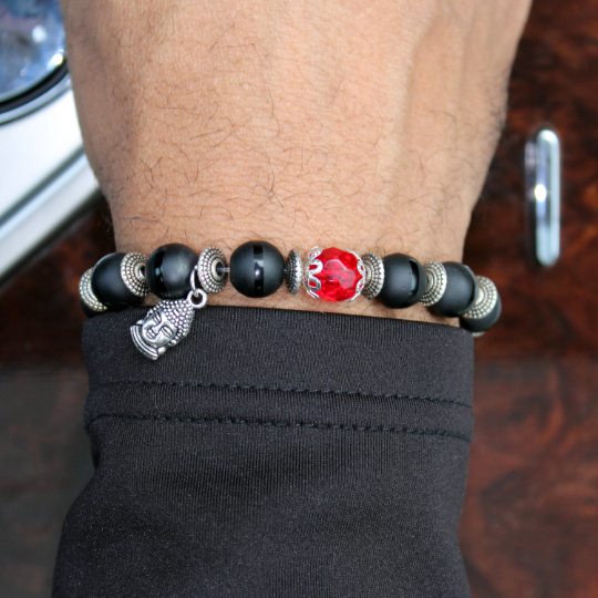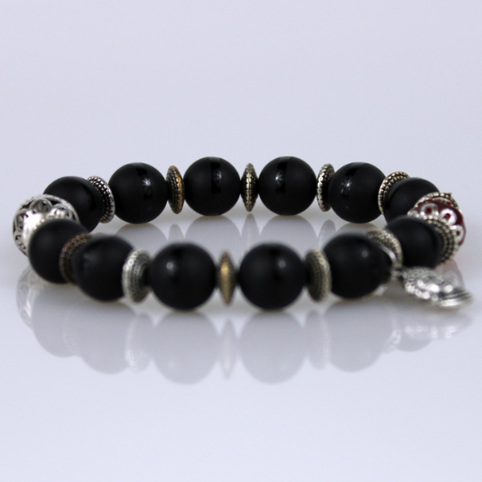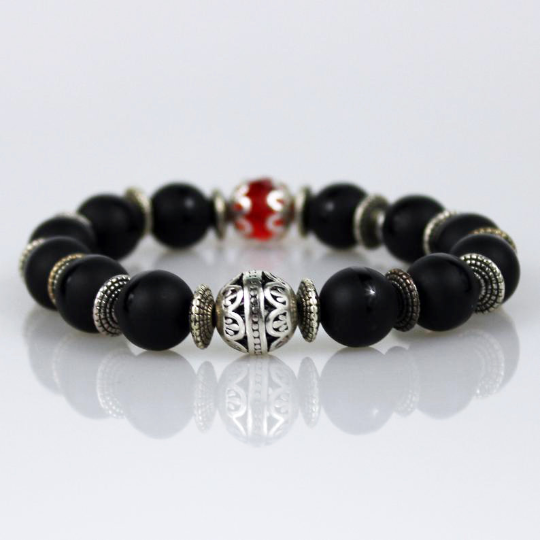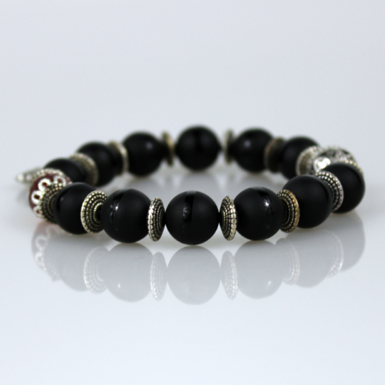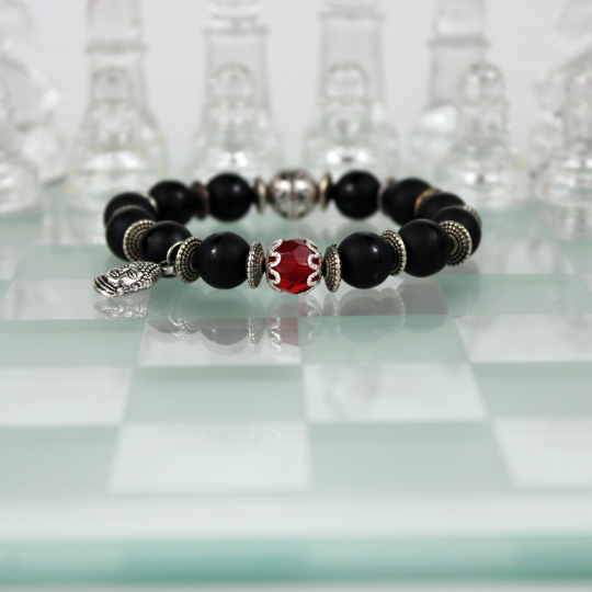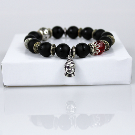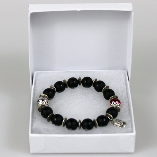 Perfect accessory piece for Spiritual Good Fortune featuring Tibetan Buddha Bracelet with Semi Precious Matte Onyx 10mm gemstones with a polished stripe, a focal Red Jade Antique Silver-Capped bead, Buddha Charm, Gunmetal Rondelles, Hematite Spacers and finishing Bali bead. A classy "One Of A Kind” piece that comes in a gift box!