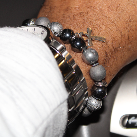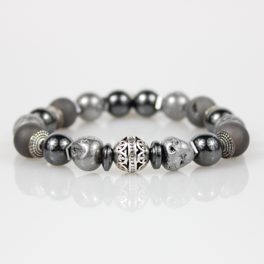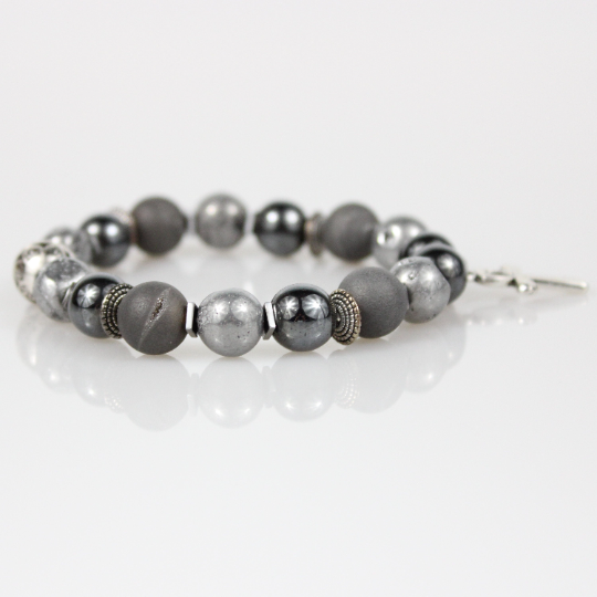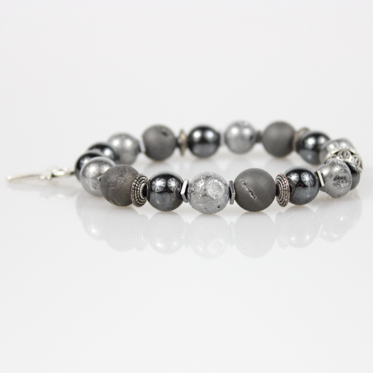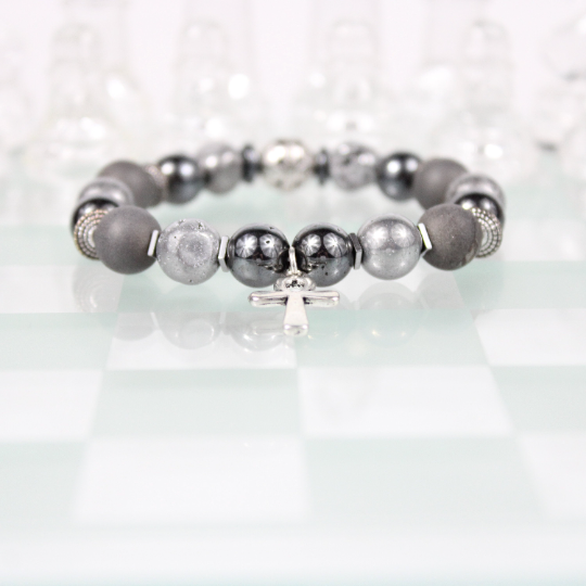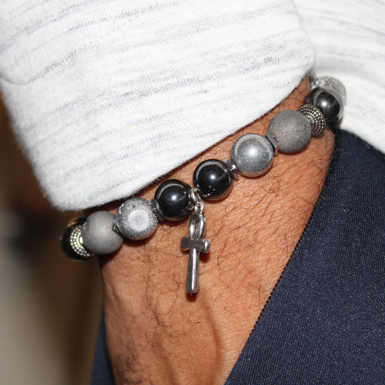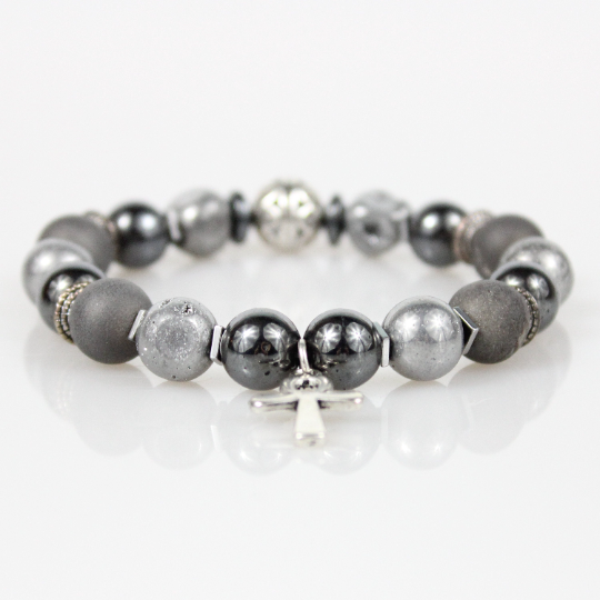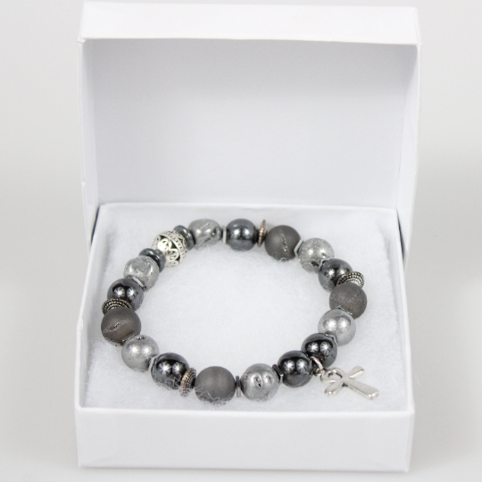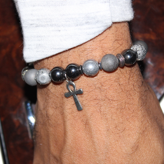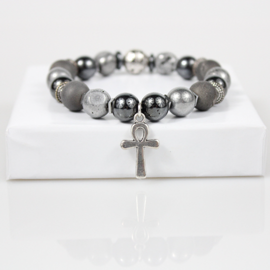 This beautiful bracelet features a stunning combination of 10mm Semiprecious Gray Marble Agates, Silver Glittered Beads, Gray Hematite, Dark Rondelles with Antique Silver Ankh. This makes a truly "One Of A Kind” piece. Very elegant bracelet fits your wrist so just measure your wrist and select your desired size! All bracelets come in a gift box!