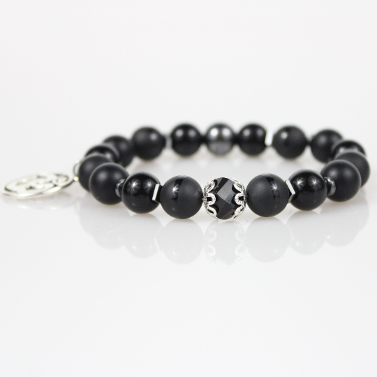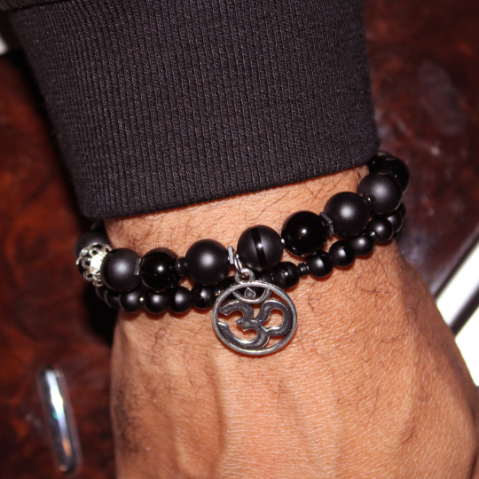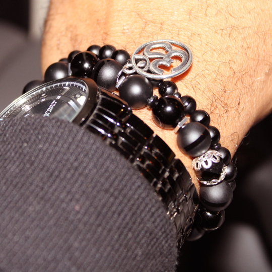 This gorgeous stackable bracelet for men or women boasts alternating black onyx beads in a glossy finish, matte finish and matte with polished stripe in 10mm beads! Also features on four opposite corners a silver-capped faceted black gemstone, a 10mm hematite bead, a large magnetic hematite spacer and an optional antique silver Aum/OM symbol charm.