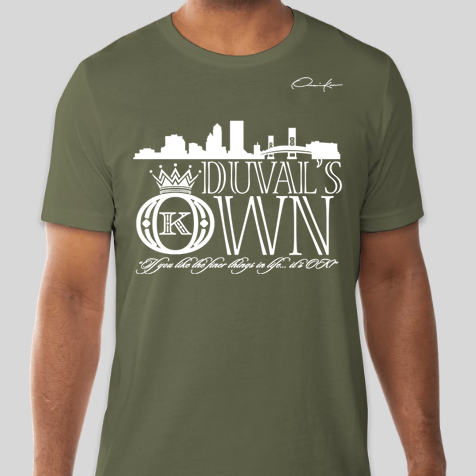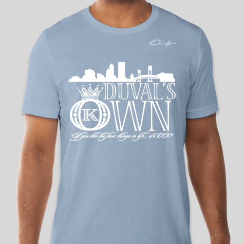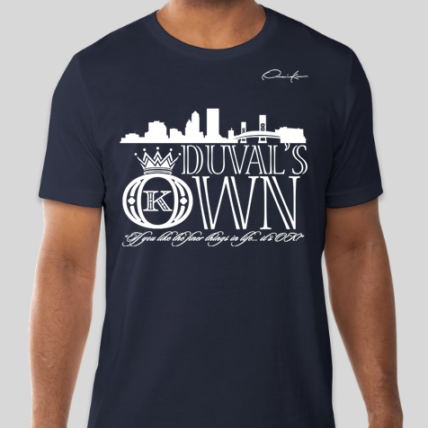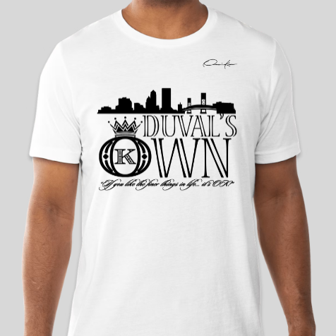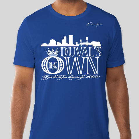 This is "Duval's Own" T-Shirt representing the city of Jacksonville FL, the largest land mass city in the nation. This is an inspirational tee in different colors with the slogan underneath the beautiful print "If you like the finer things in life... it's OK!" to help show local pride for a fast growing city. Shout out to the Jaguars! It has the Jacksonville city skyline featuring the blue bridge, the official Onassis Krown signature on the front chest over the heart and the vertical, angel wings spinal cord logo on the back. If you don't see the Onassis Krown label on the inside then it's NOT official!