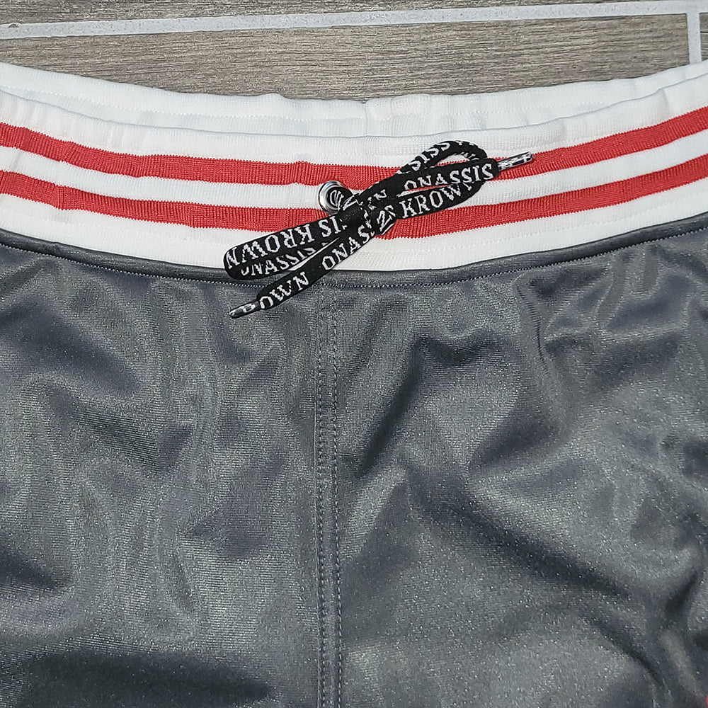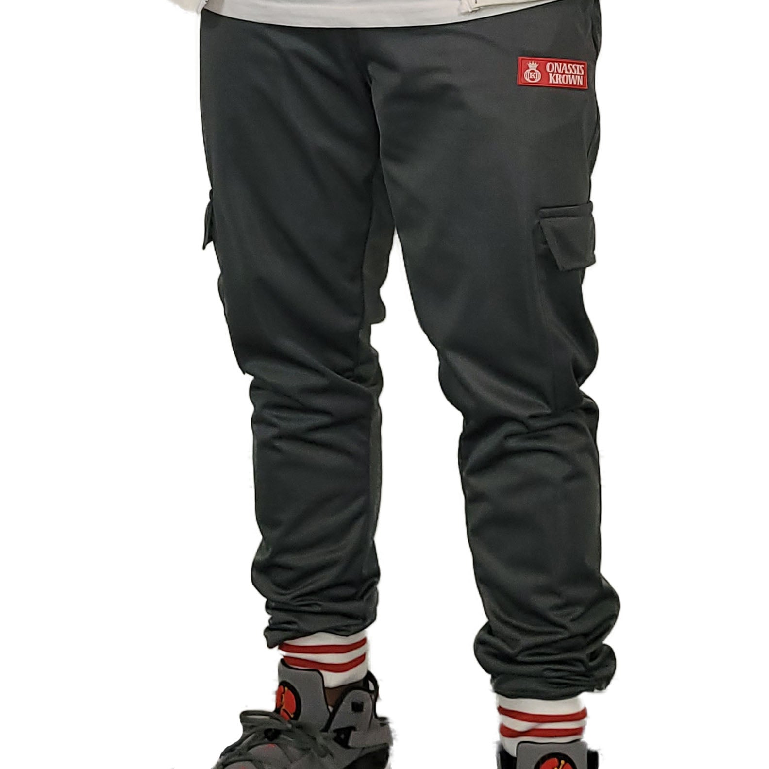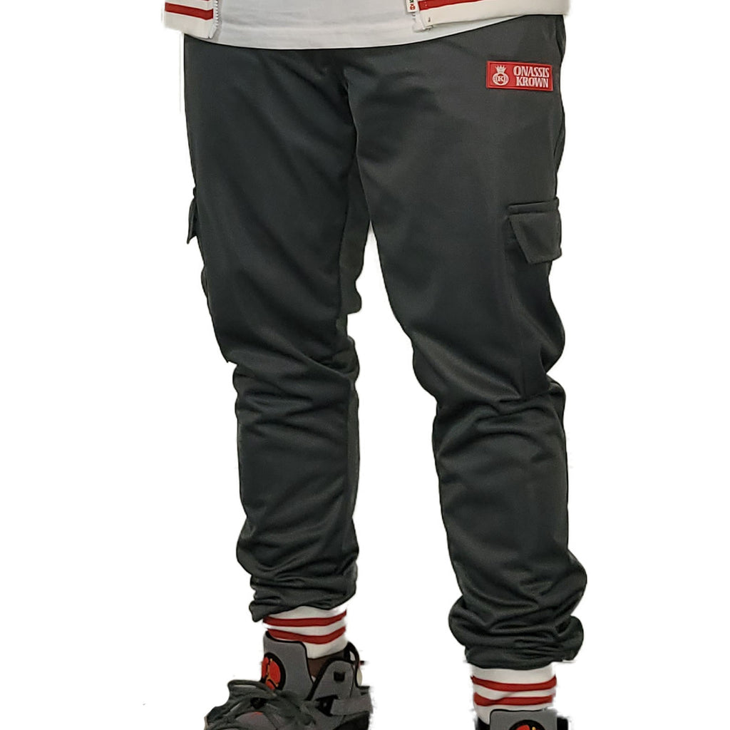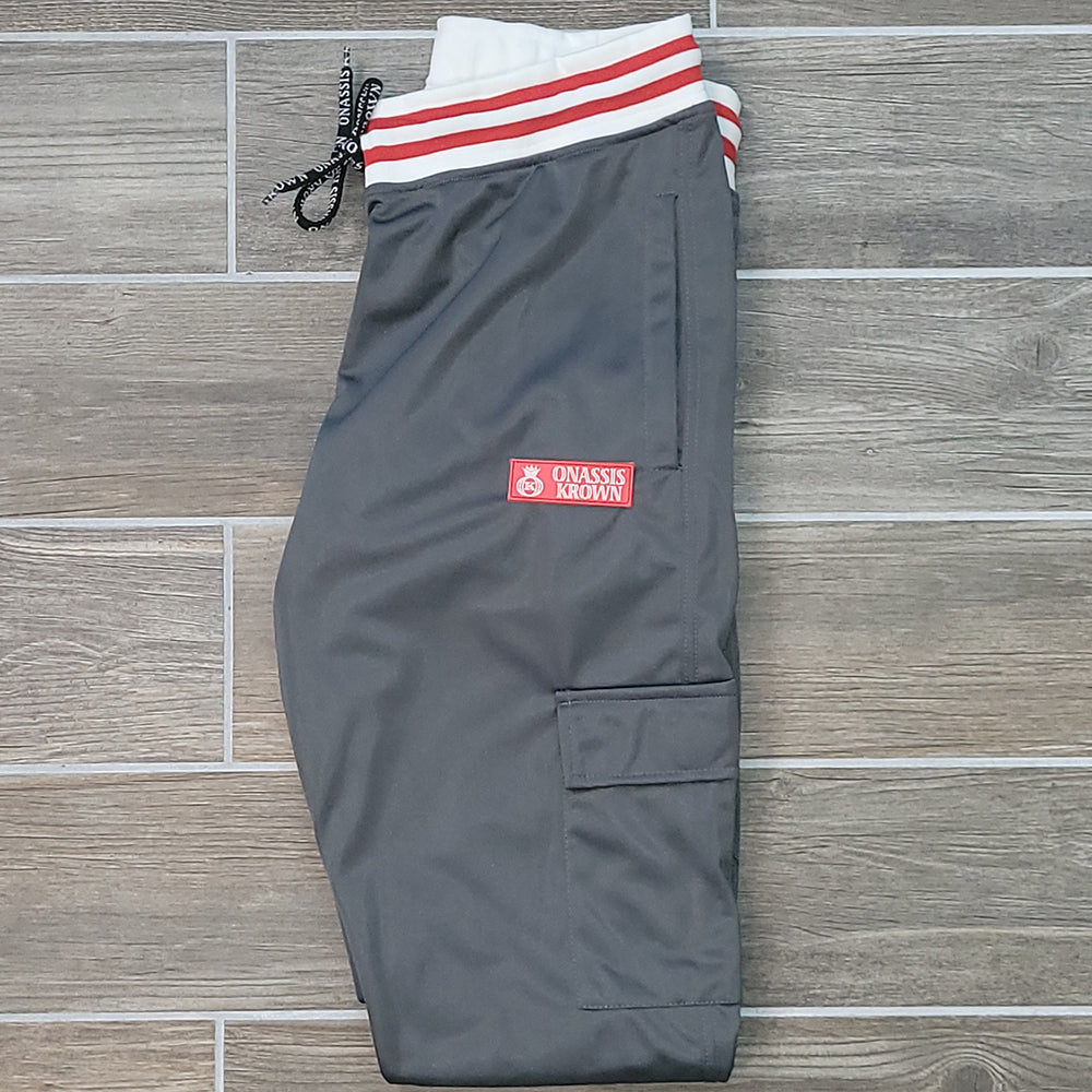 These gray sweatpants can be matched with the jacket for a full set or purchased separately. They have the velvety black finish that is lightweight but thick enough to be warm. They have the matching ribbed waistline and ankle bottoms in red & white stripes, the red pvc label with the signature Onassis Krown brand and logo as well as the Onassis Krown labeled drawstrings.