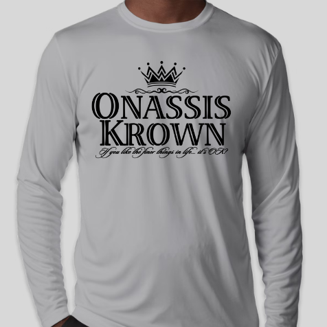 Long Sleeve Onassis Krown T-Shirt with Krown on the sleeve! Be one of the first on your block to represent! This shirt is made of great cotton quality and bright, colorful graphics on the front and company logo on the back! Simply find your size and then choose from the colors of White, Black, Navy Blue, Red, Steel Gray, Royal Blue or Army Green!