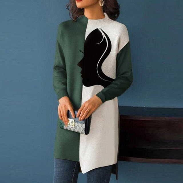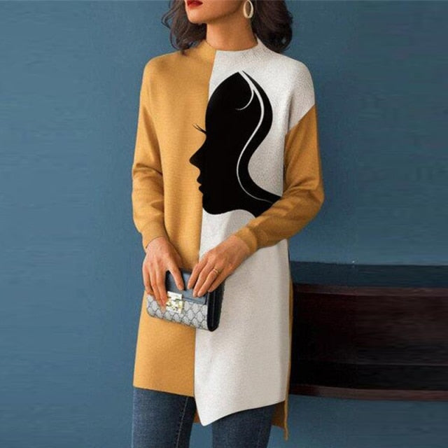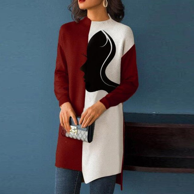 This long sleeve abstract pattern, two-tone color top can double as a blouse and/or dress. This top is casual and elegant for a sophisticated lady in several colors!