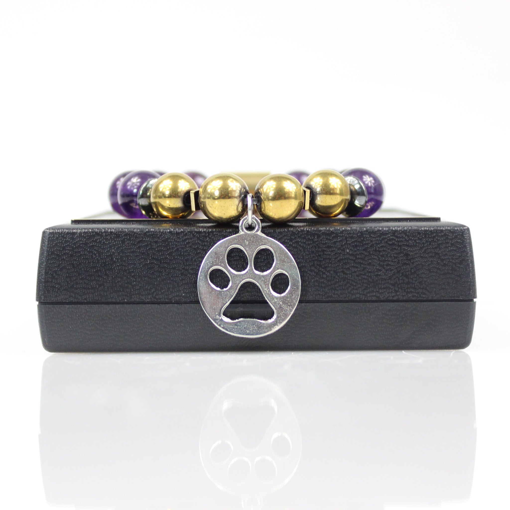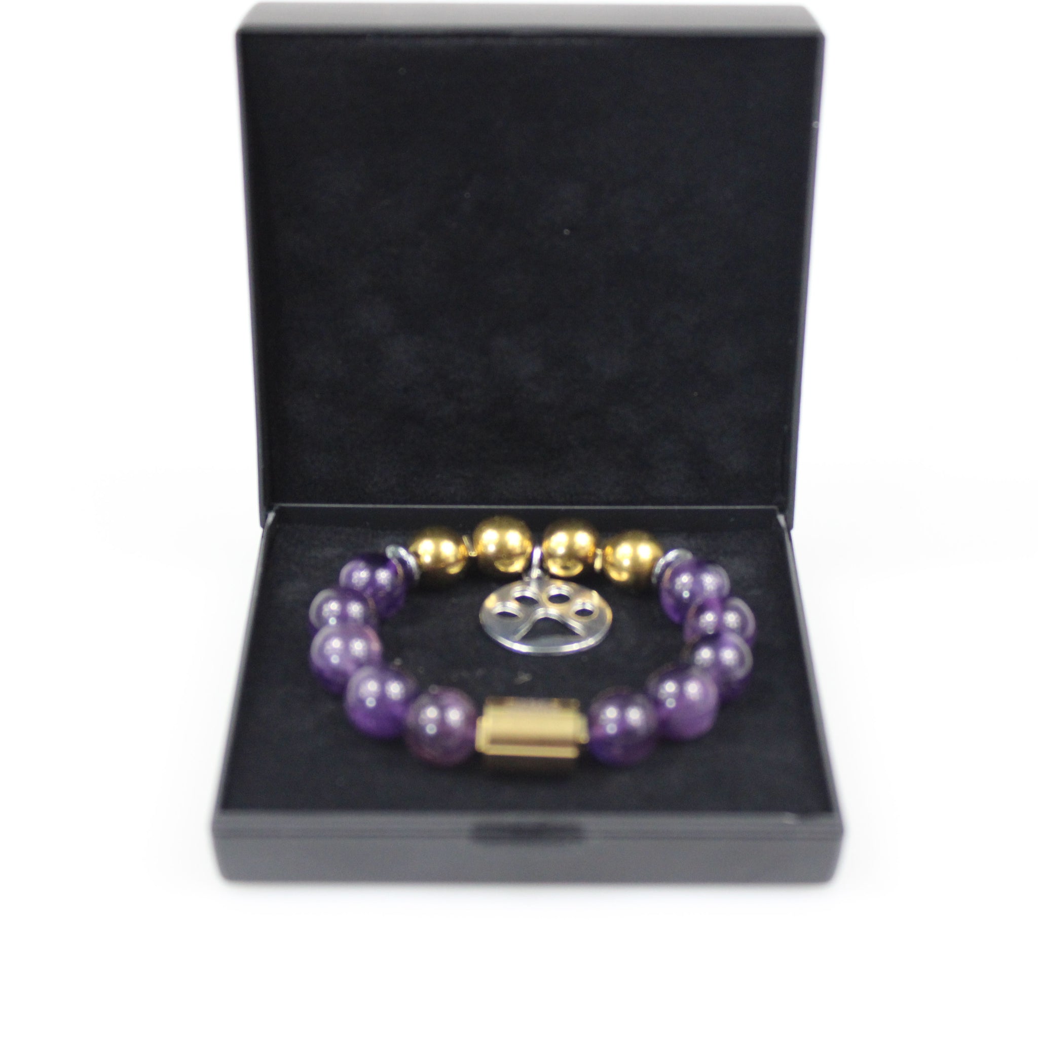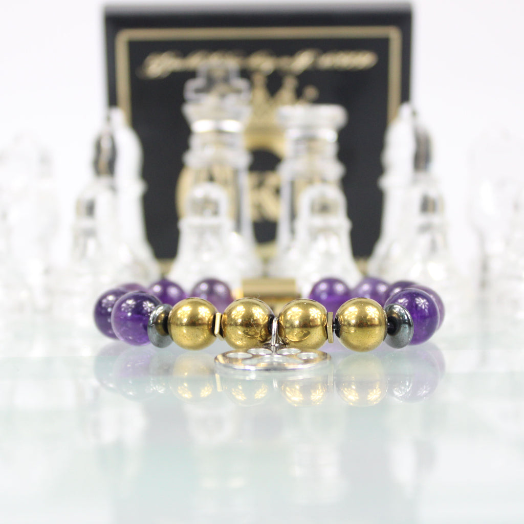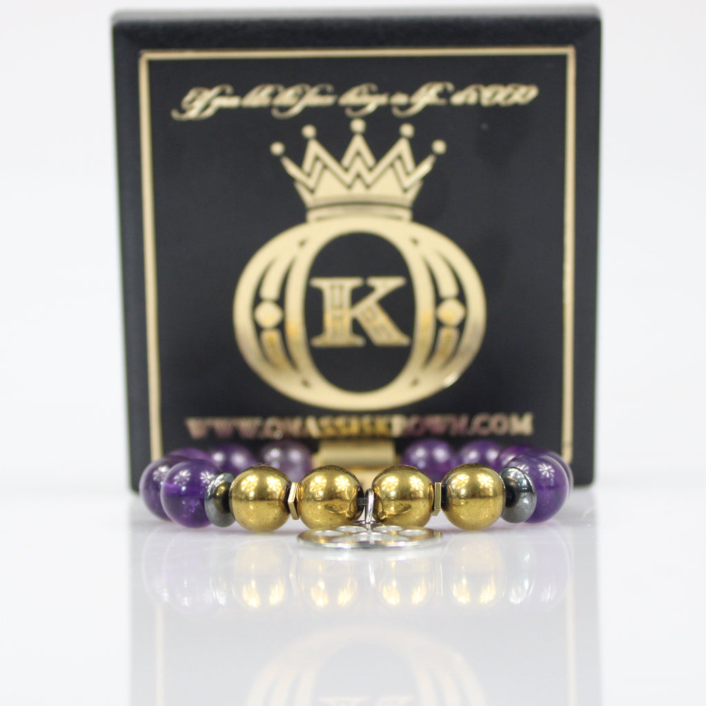 The other side has two more gold beads with a silver-capped purple center bead. Enjoy a classy array of purple & gold in this "One Of A Kind” piece. All bracelets come in a gift box!