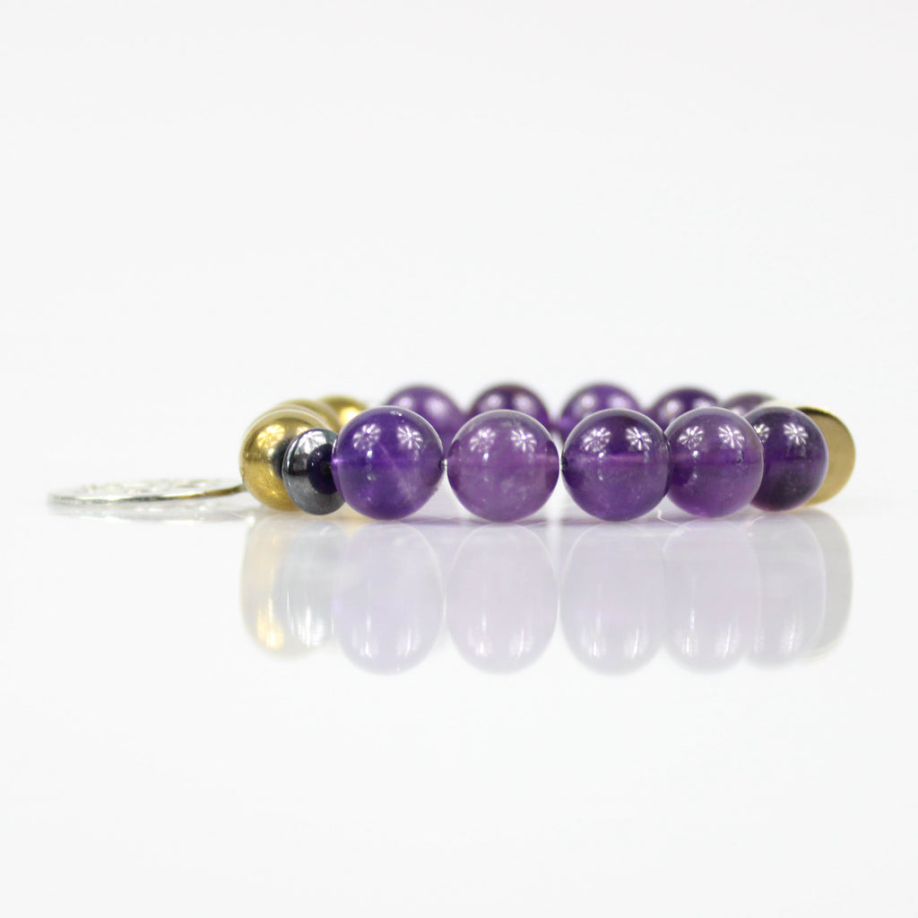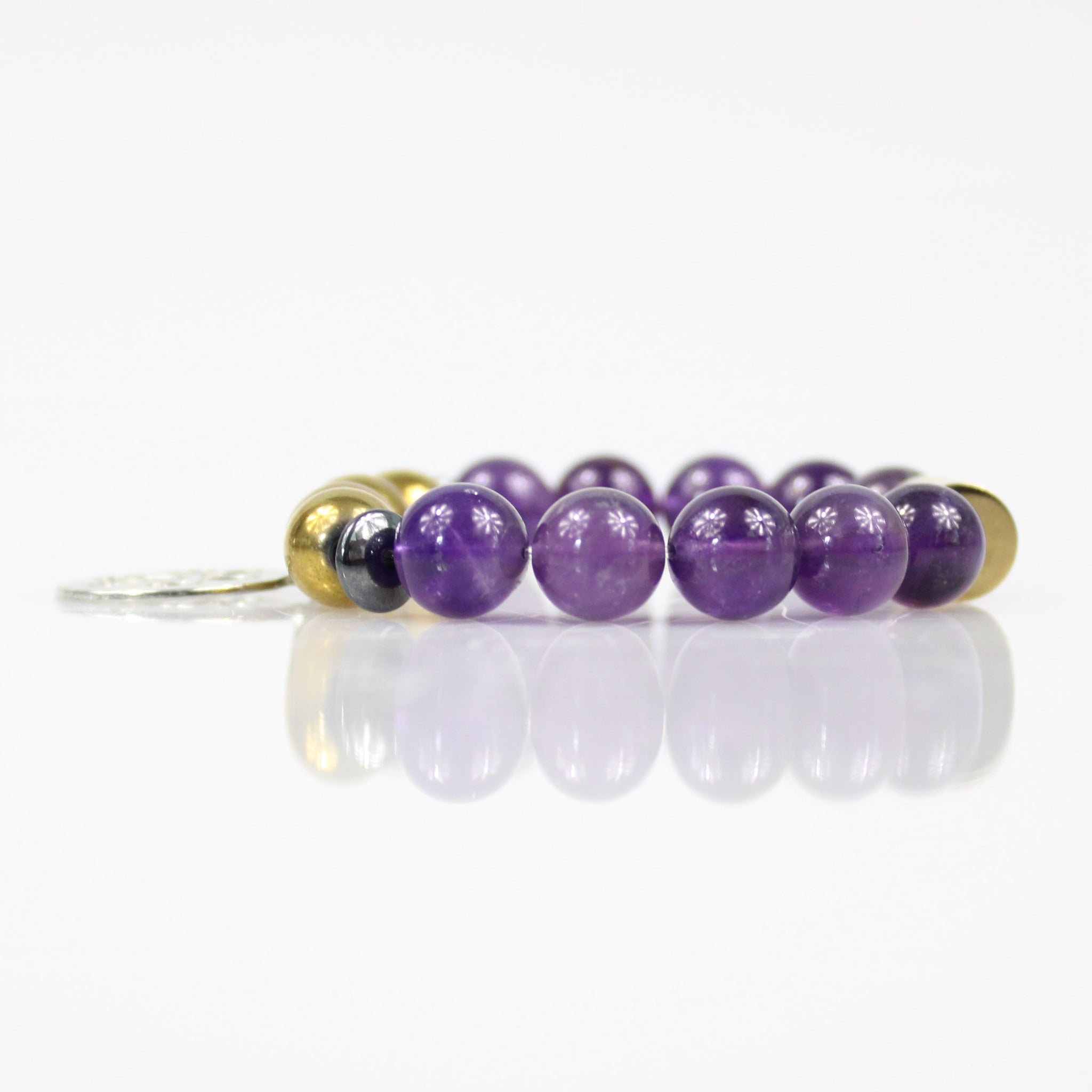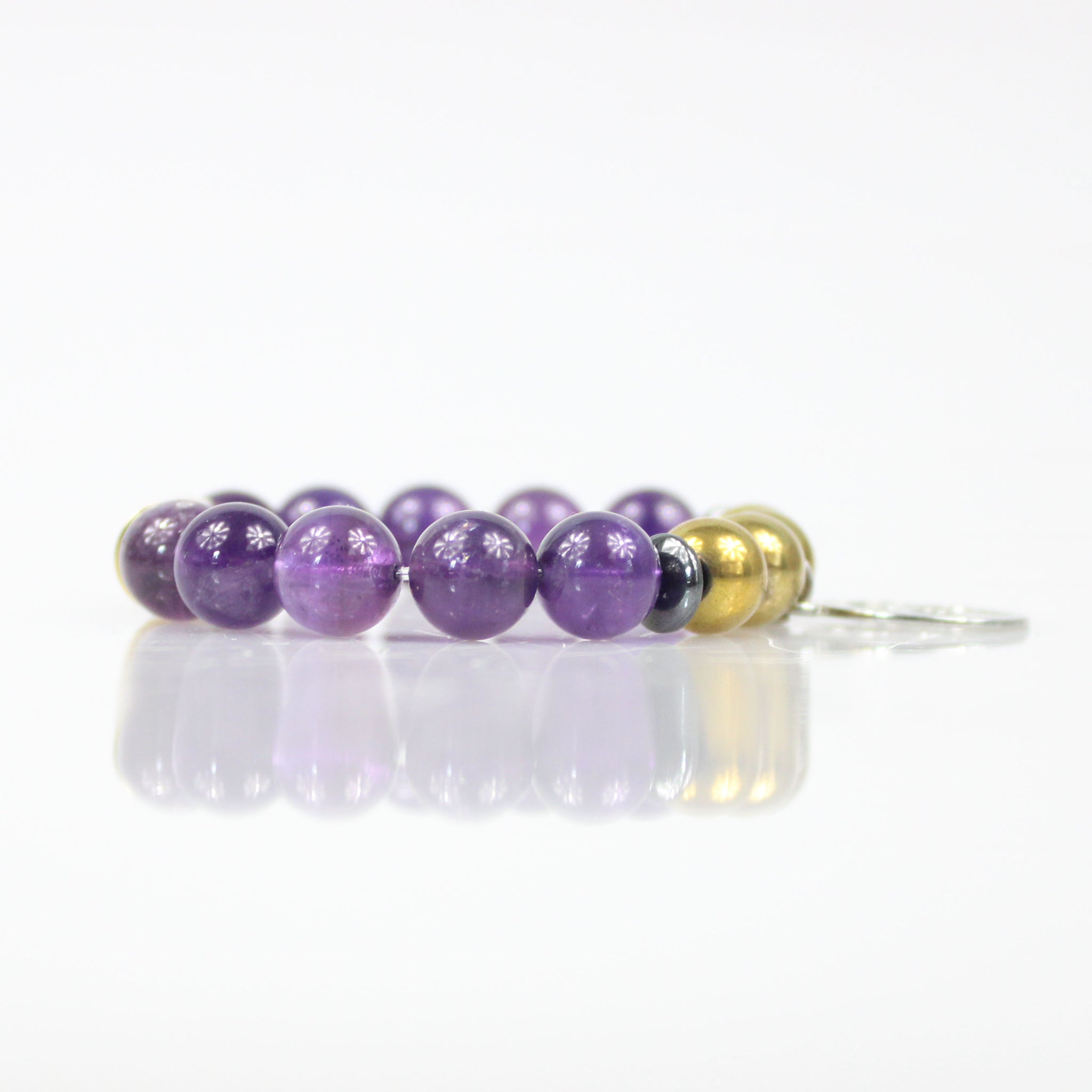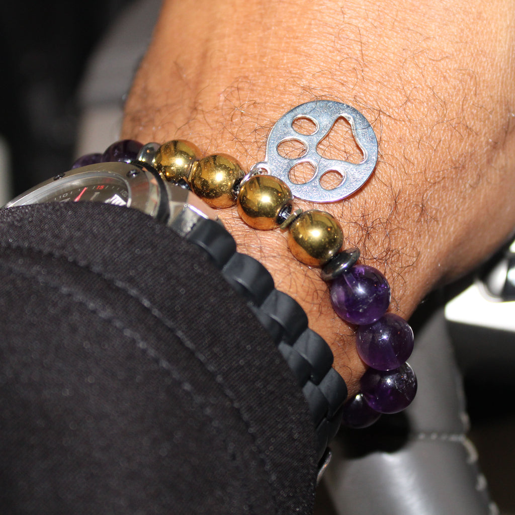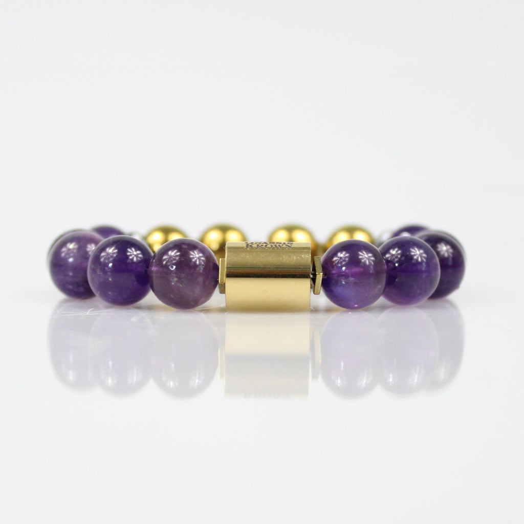 The other side has two more gold beads with a silver-capped purple center bead. Enjoy a classy array of purple & gold in this "One Of A Kind” piece. All bracelets come in a gift box!