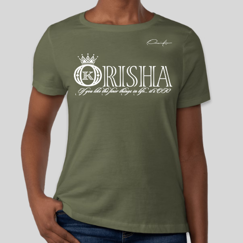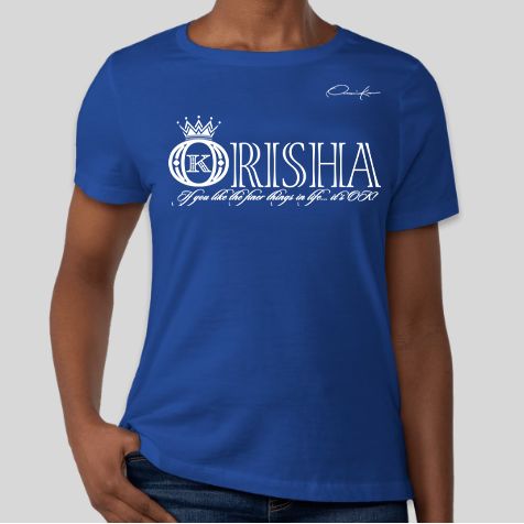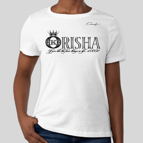 Orishas T-Shirt with the official Onassis Krown signature on the front chest over the heart and vertical, angel wings spinal cord logo WEAR YOUR KROWN on the back. If you don't see the Onassis Krown label on the inside then it's NOT official! "If you like the finer things in life... it's OK!"