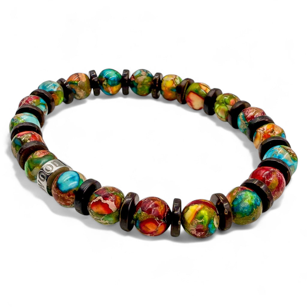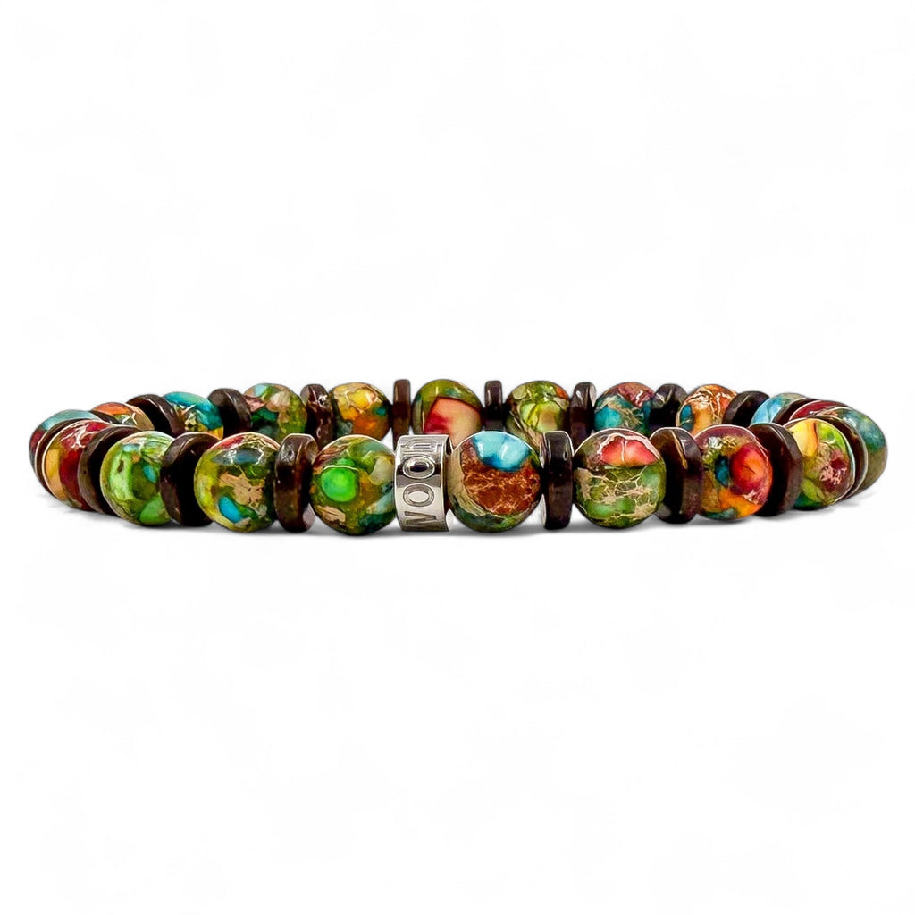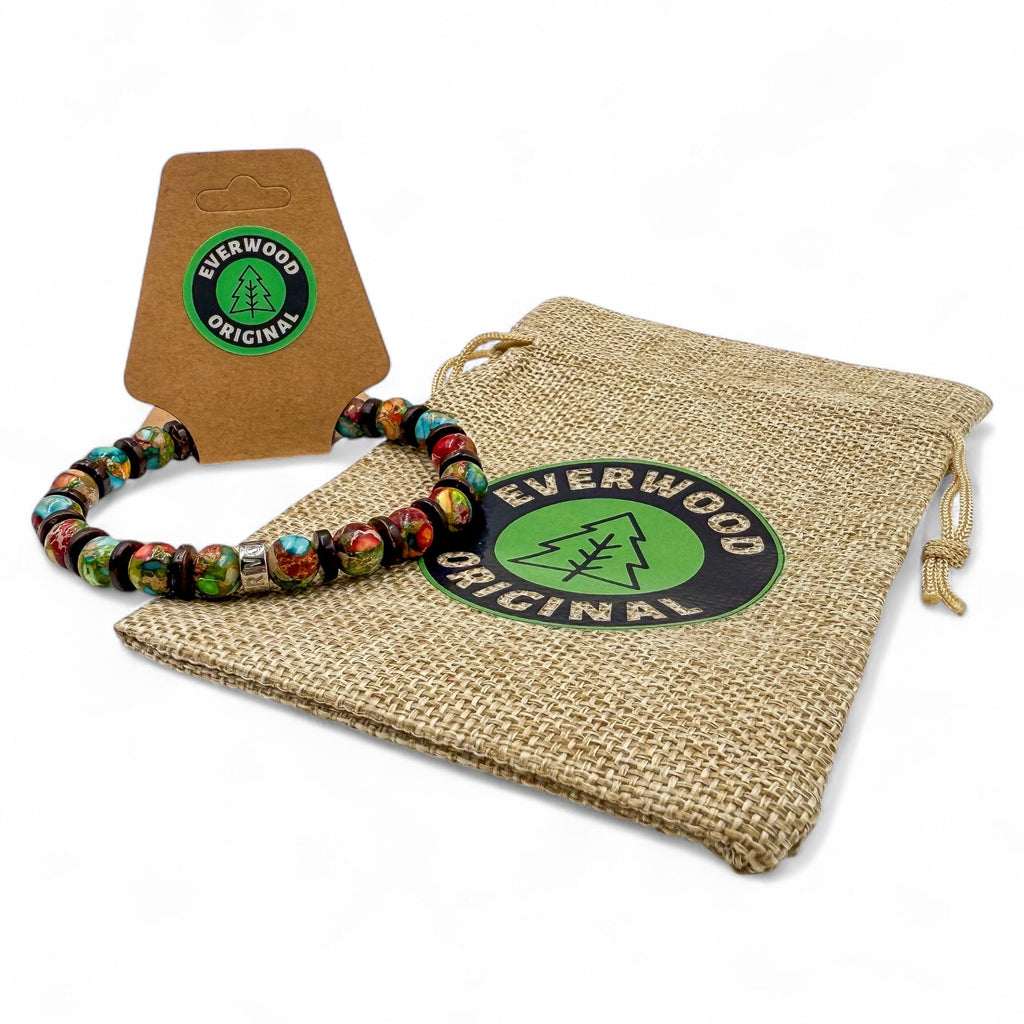 Turn heads without saying a word. The Jungle Fiesta bracelet is all about bold color and natural style. With vibrant rainbow jasper beads bringing the energy and warm brown coconut wood adding that earthy balance, this piece is like a tropical escape for your wrist. The polished silver stainless steel spacer—engraved with the EVERWOOD name—adds a clean, premium finish. Perfect for summer vibes, weekend getaways, or just breaking up the black-and-grey wardrobe, Jungle Fiesta brings personality and punch to your everyday carry.