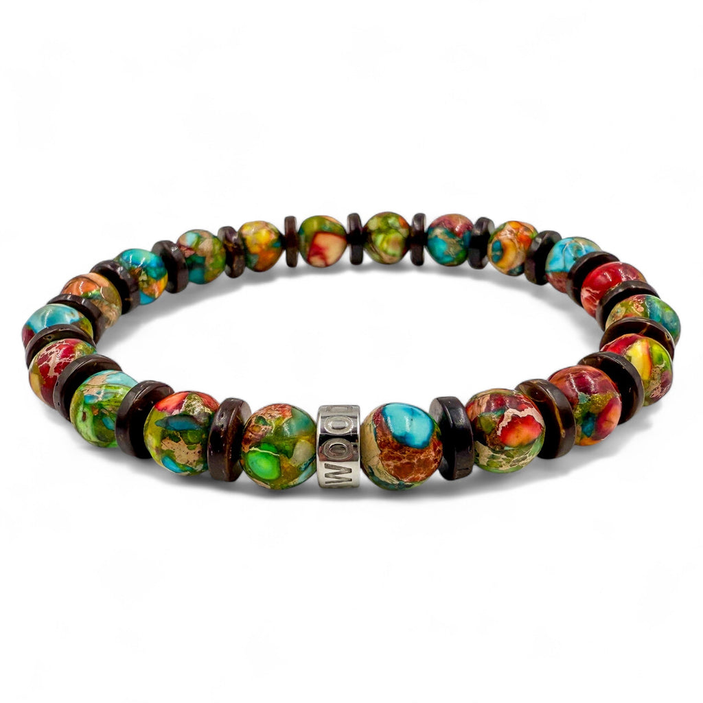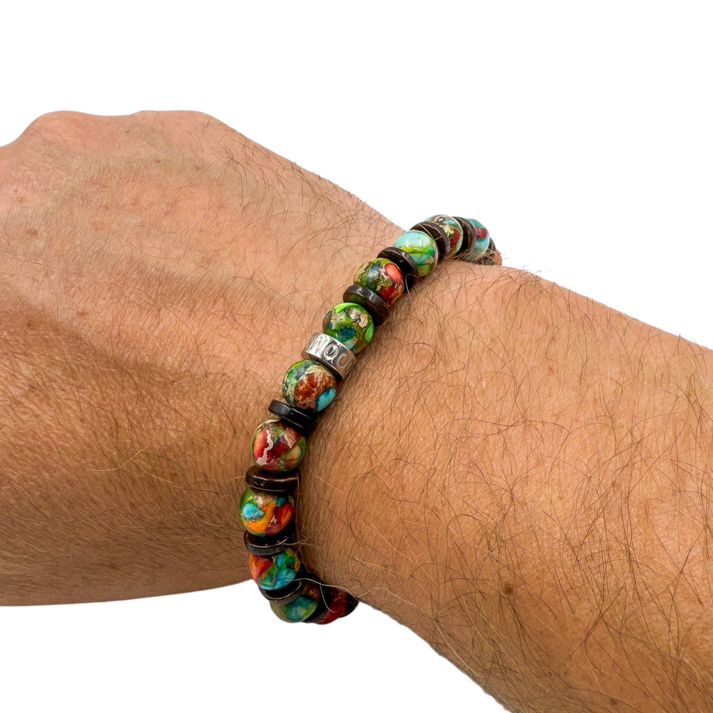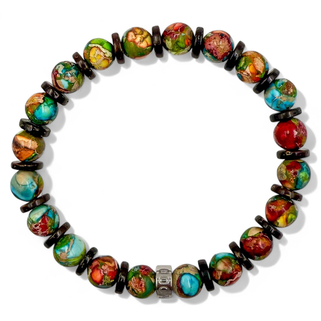 Turn heads without saying a word. The Jungle Fiesta bracelet is all about bold color and natural style. With vibrant rainbow jasper beads bringing the energy and warm brown coconut wood adding that earthy balance, this piece is like a tropical escape for your wrist. The polished silver stainless steel spacer—engraved with the EVERWOOD name—adds a clean, premium finish. Perfect for summer vibes, weekend getaways, or just breaking up the black-and-grey wardrobe, Jungle Fiesta brings personality and punch to your everyday carry.