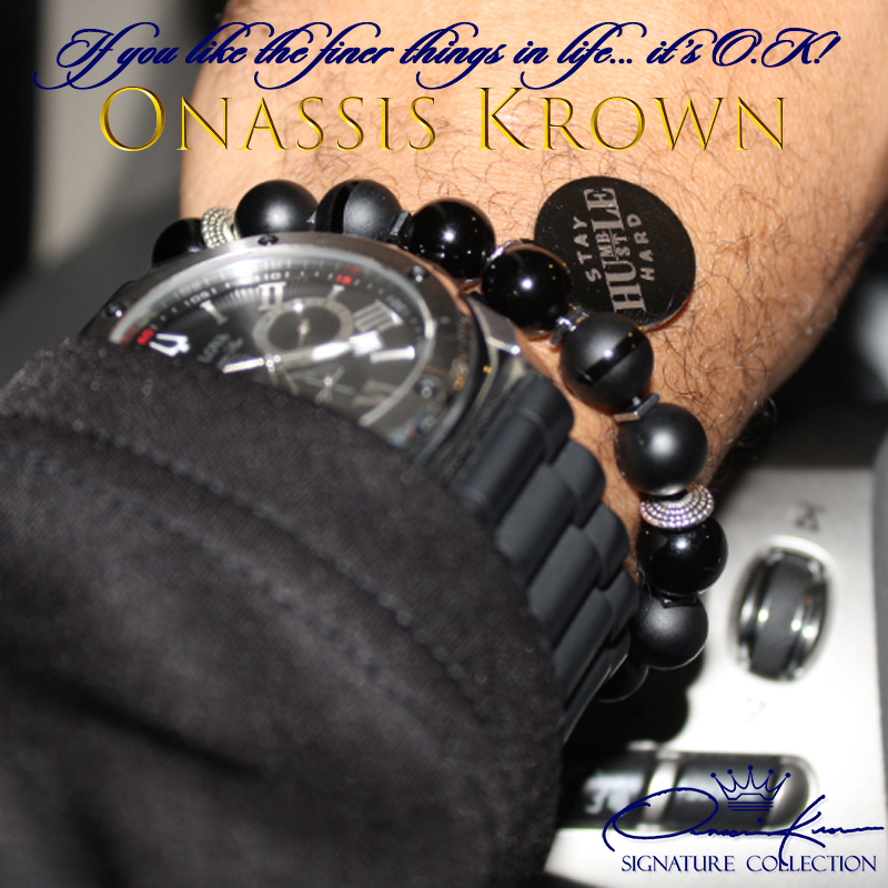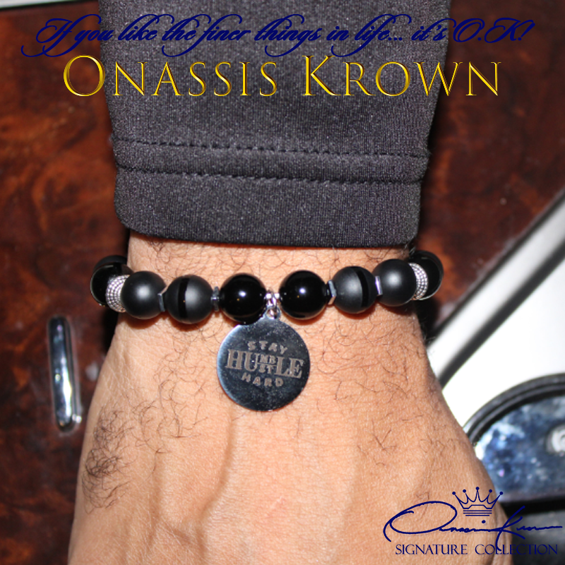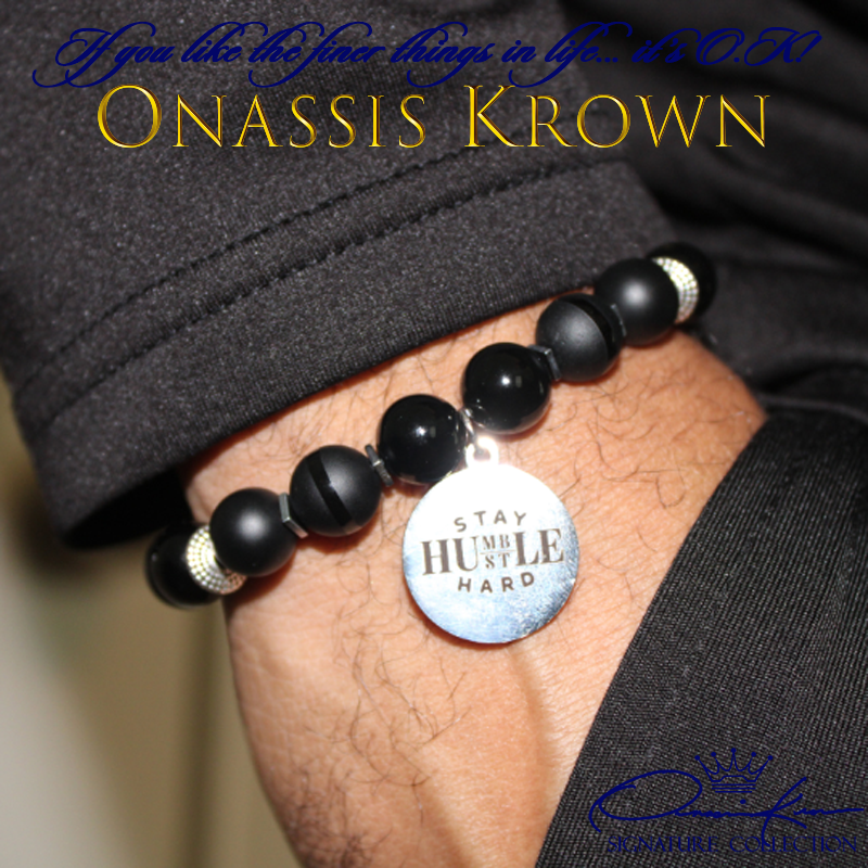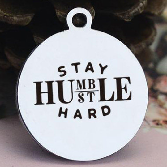 It has a sterling silver charm pendant with "Stay Humble, Hustle Hard" engraved on the front. It also has antique silver spacers and magnetic hematite. Enjoy this classy array of all black in this "One Of A Kind” piece.