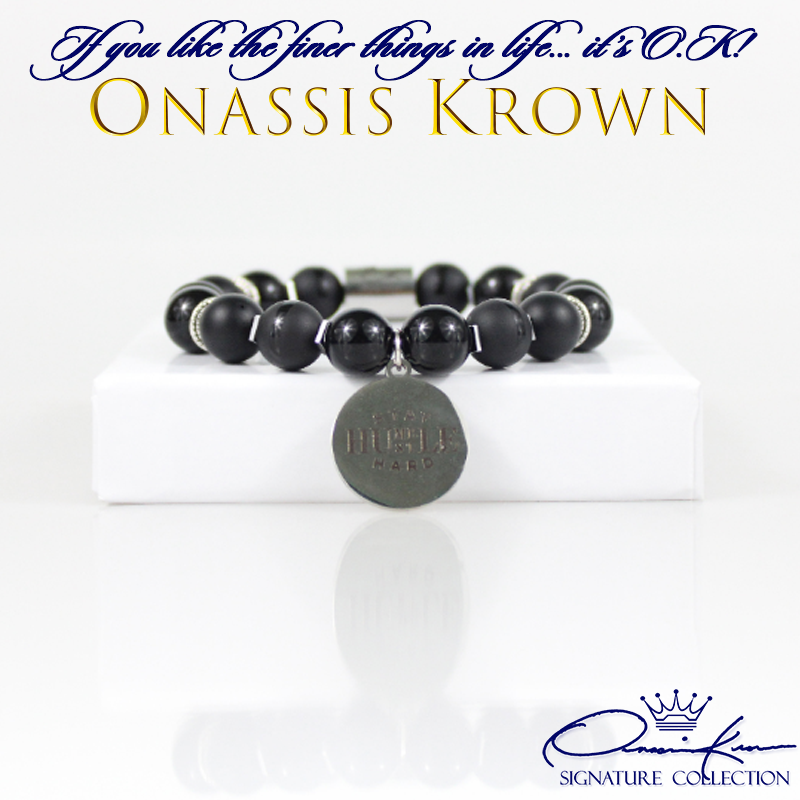 This stunning bracelet is made with black jade and onyx in three types of 10mm beads including black matte, glossy black with a matte bead with shiny polished stripe. Makes a great gift for hustlers, entrepreneurs, business owners, go getters and those who like a daily motivational reminder.