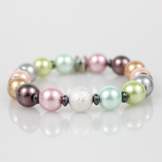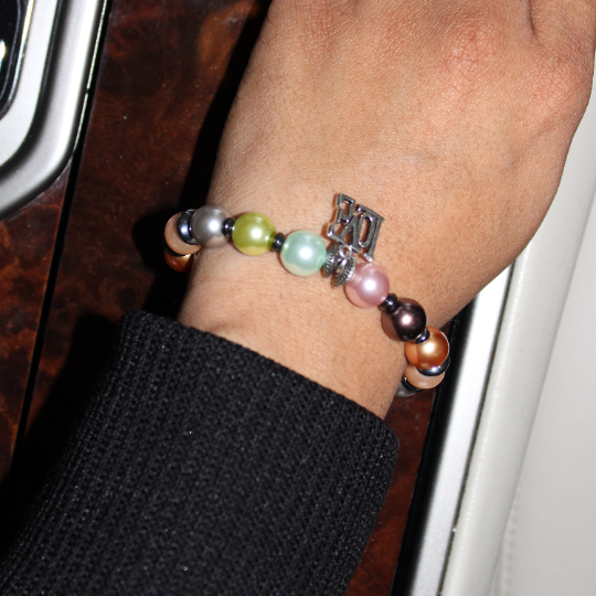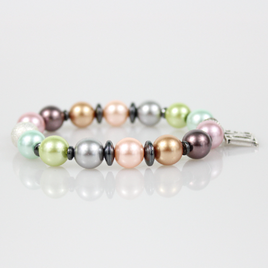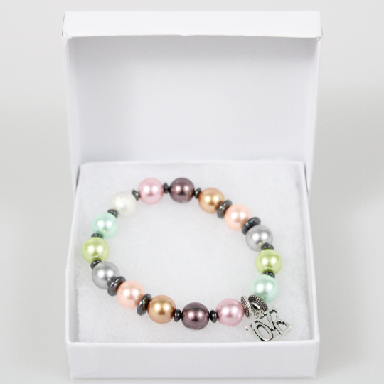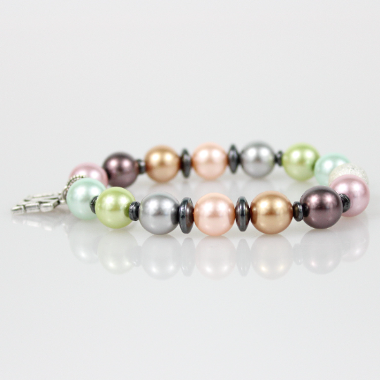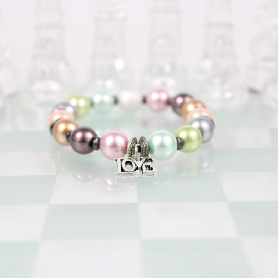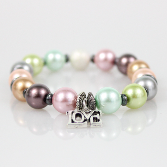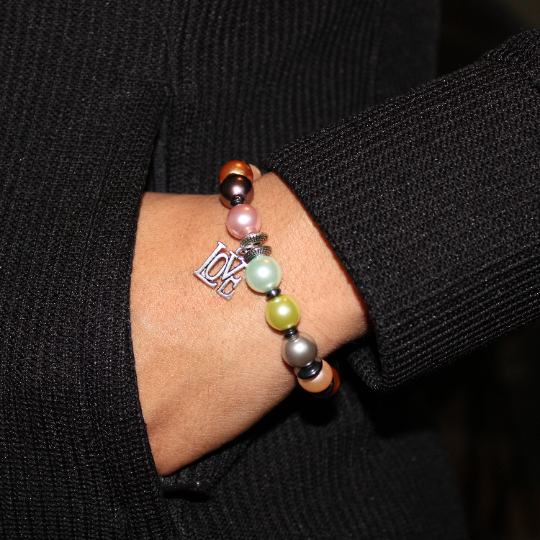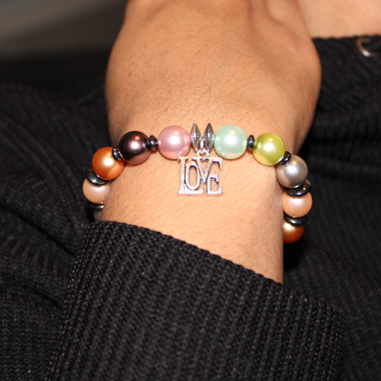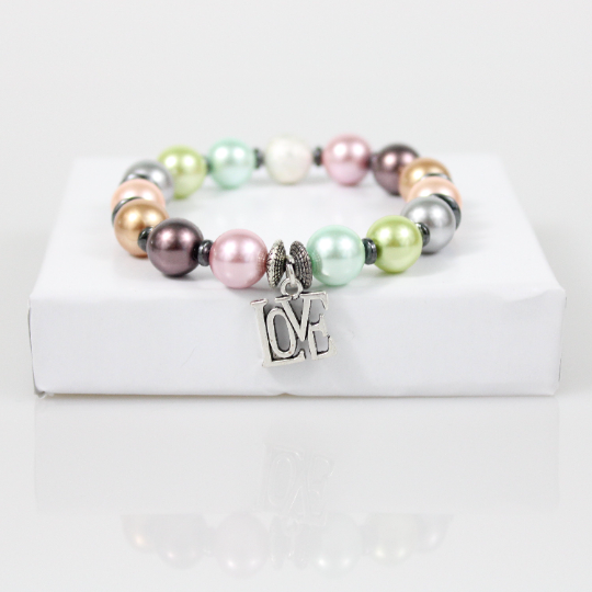 This beautiful bracelet features a stunning combination of Multi-Colored Tahitian Pearl Agates 10mm, Silver Glittered Bead, Silver Square Hematite, Dark Rondelle Hematite with Antique Silver Love Pendant. This makes a truly "One Of A Kind” piece. All bracelets come in a gift box!