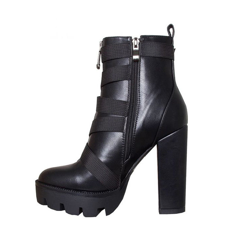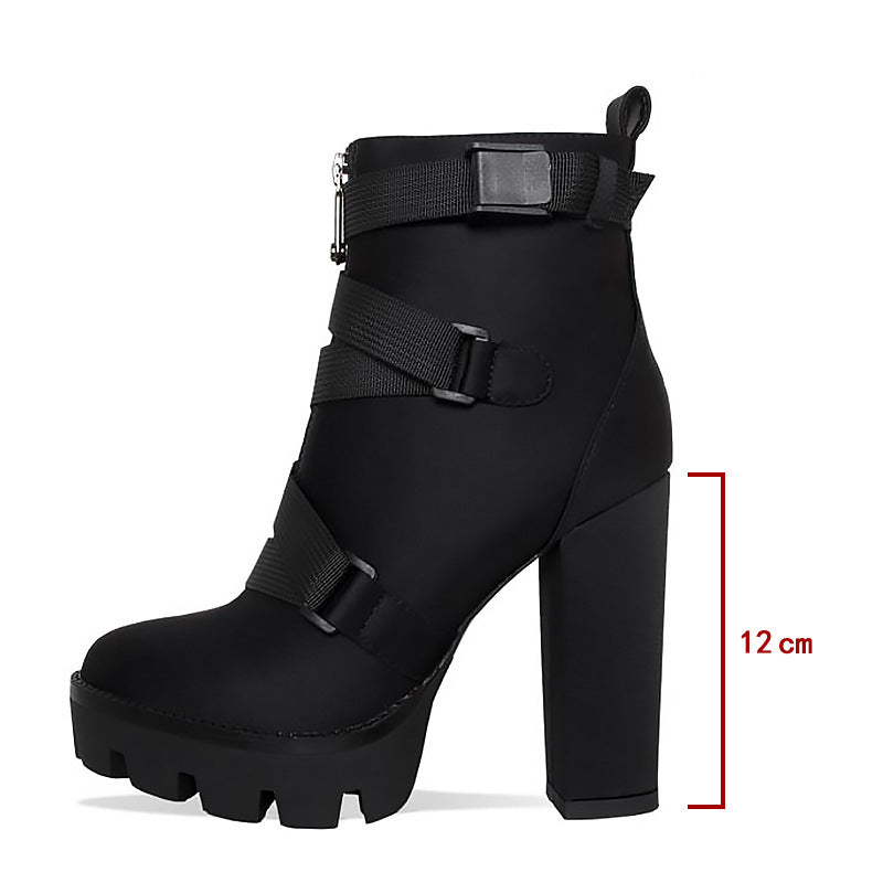 These beautiful black boots have a high platform style heel, a stylish and fashionable adjustable strap that cris-crosses along the front as well as a zipper side to easily put on and take off after a full day's wear because they're just that comfortable.