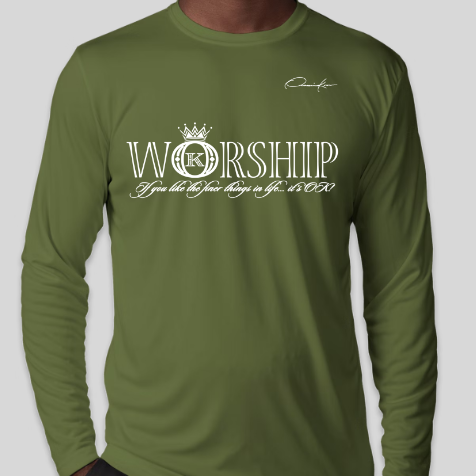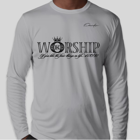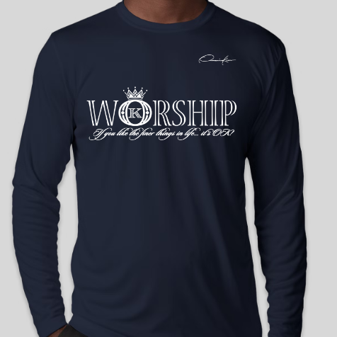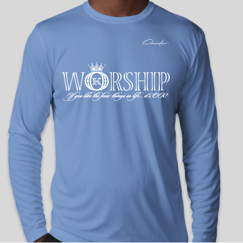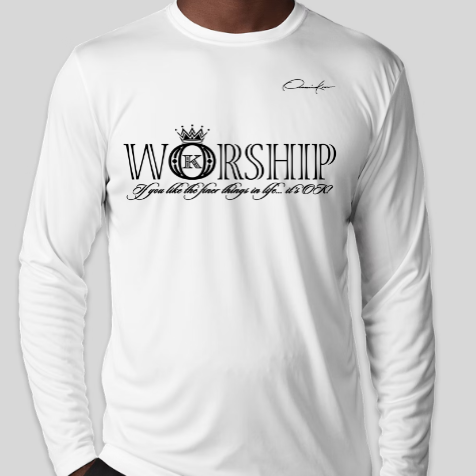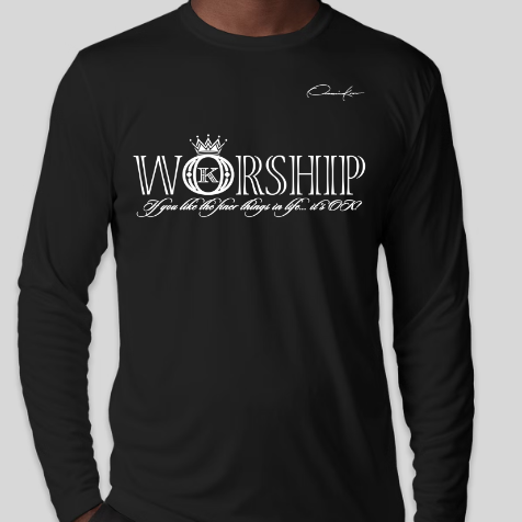 Worship long sleeve shirt with the official Onassis Krown signature on the front chest over the heart and vertical, angel wings spinal cord logo WEAR YOUR KROWN on the back. If you don't see the Onassis Krown label on the inside then it's NOT official! This shirt is made of great cotton quality and bright, colorful graphics on the front and company logo on the back! "If you like the finer things in life... it's OK!"